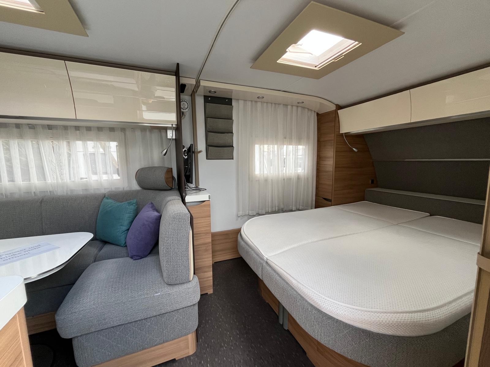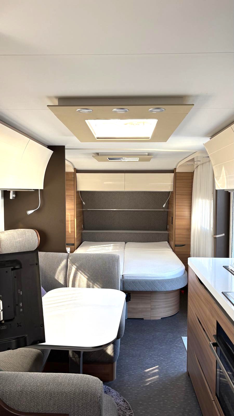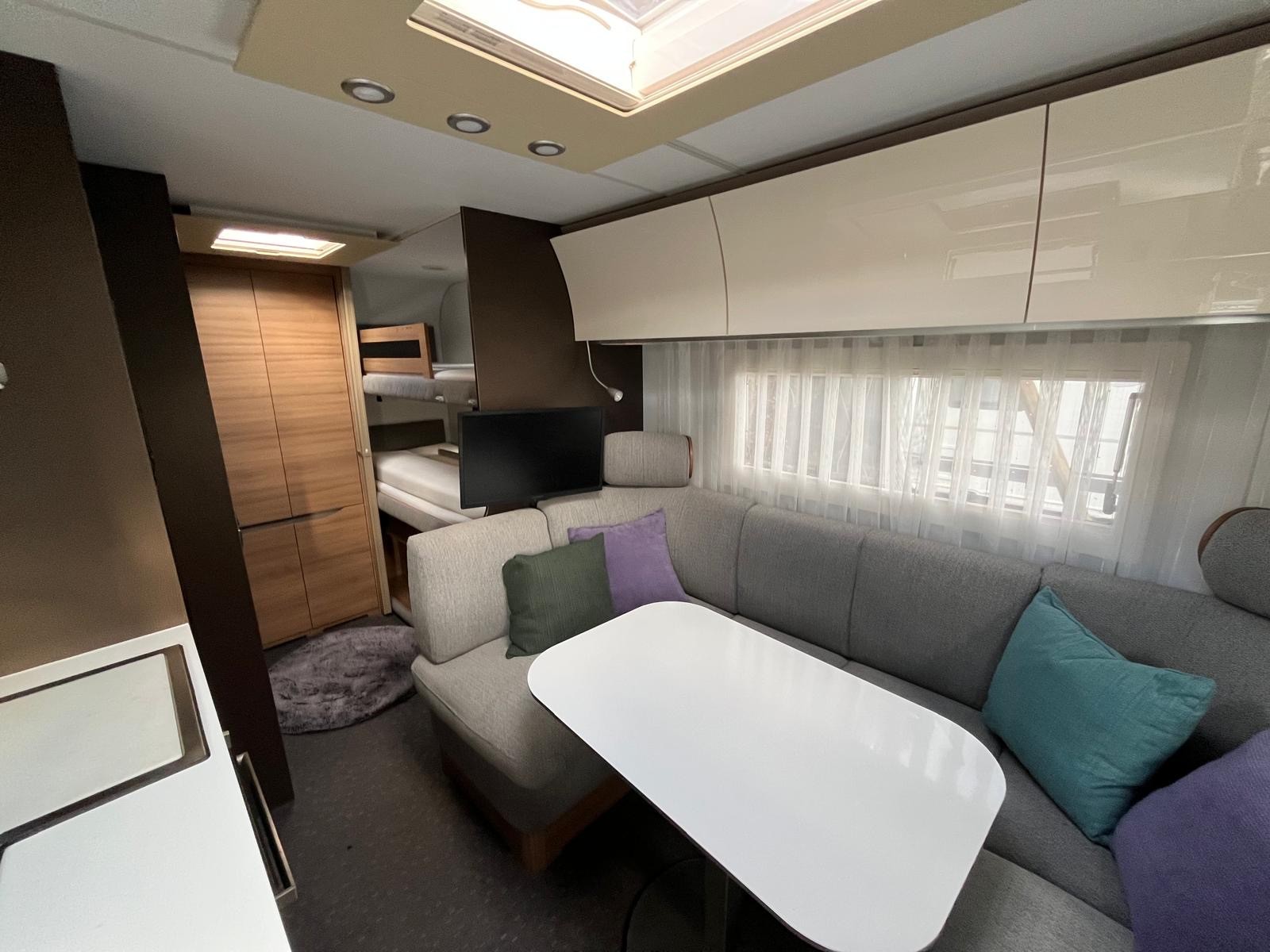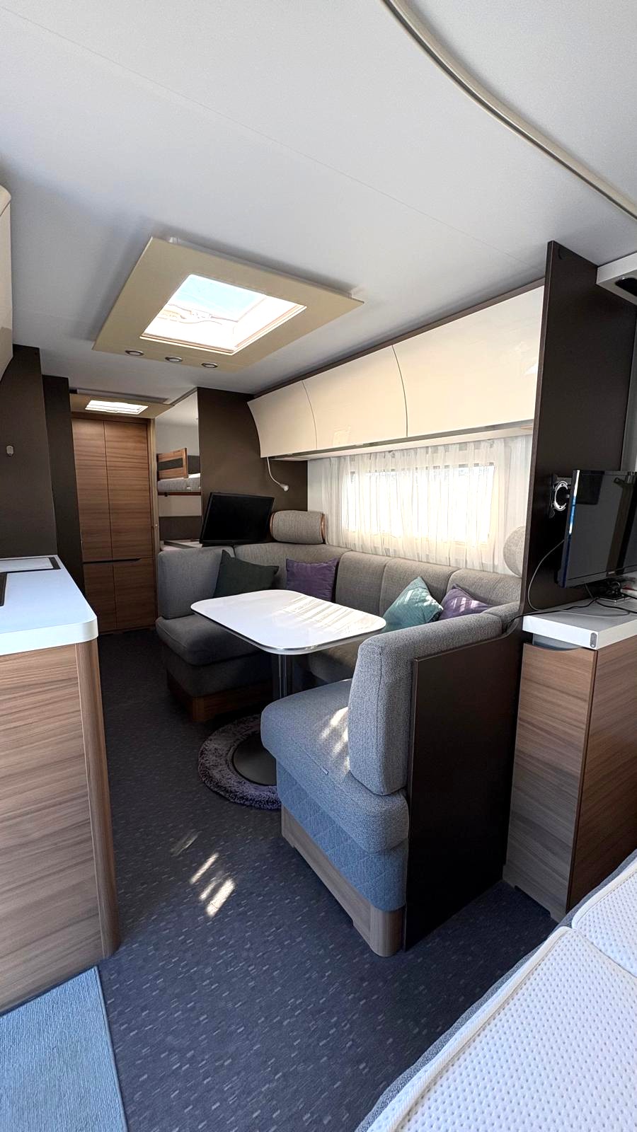Queensbett im Bug, Mittelsitzgruppe (kann zu einem Bett umgebaut werden), 3er Stockbett im Heck, Antischlingerkupplung, alle Fenster ausstellbar mit Fliegengitter und Verdunkelungsrollo, Serviceklappe unter dem Stockbett, großer Kühlschrank, Fliegengittertür