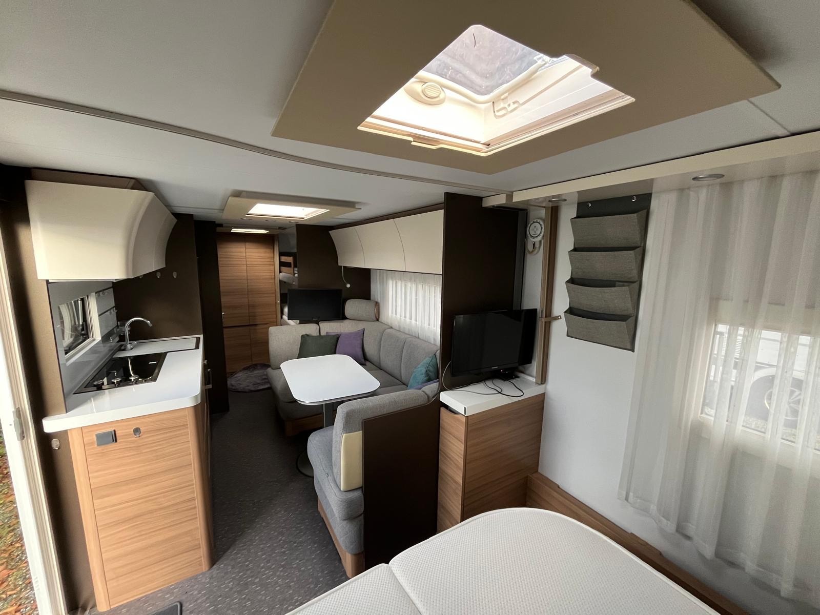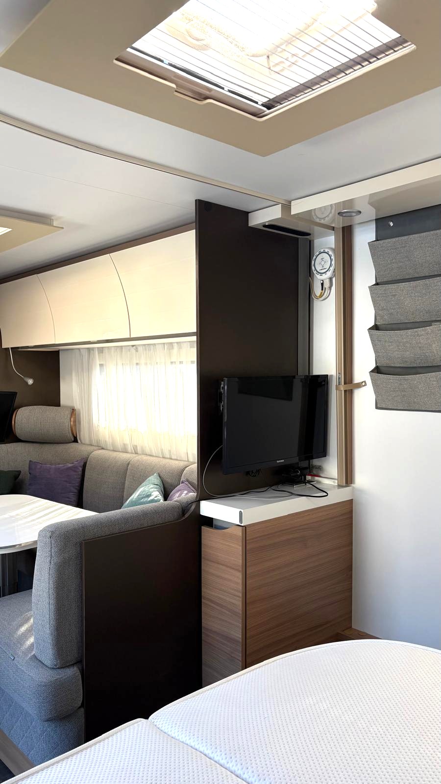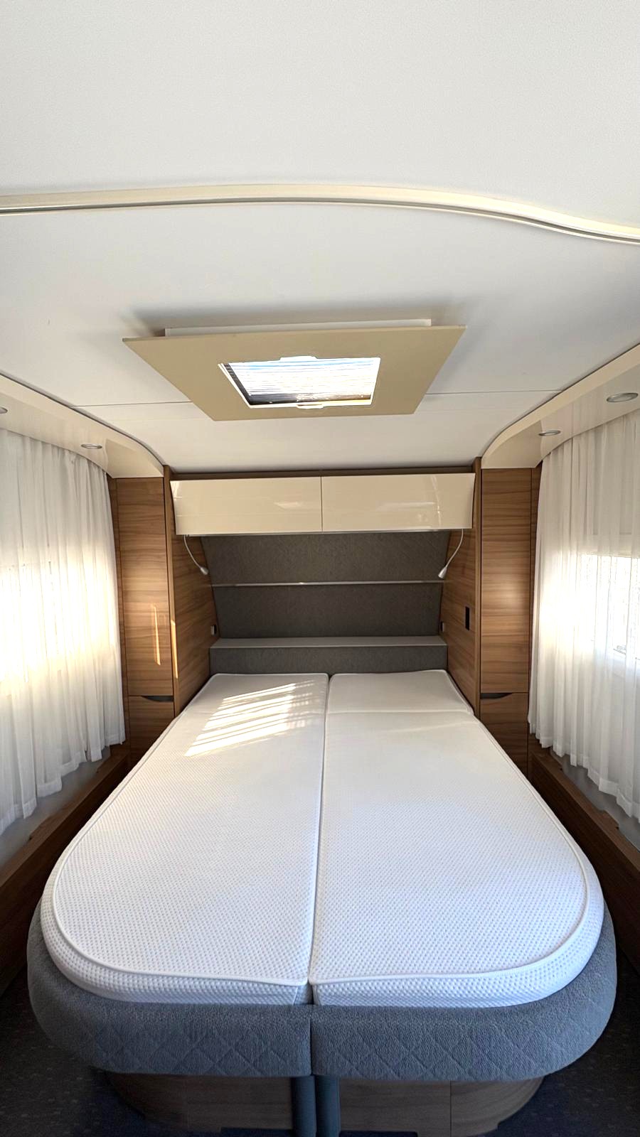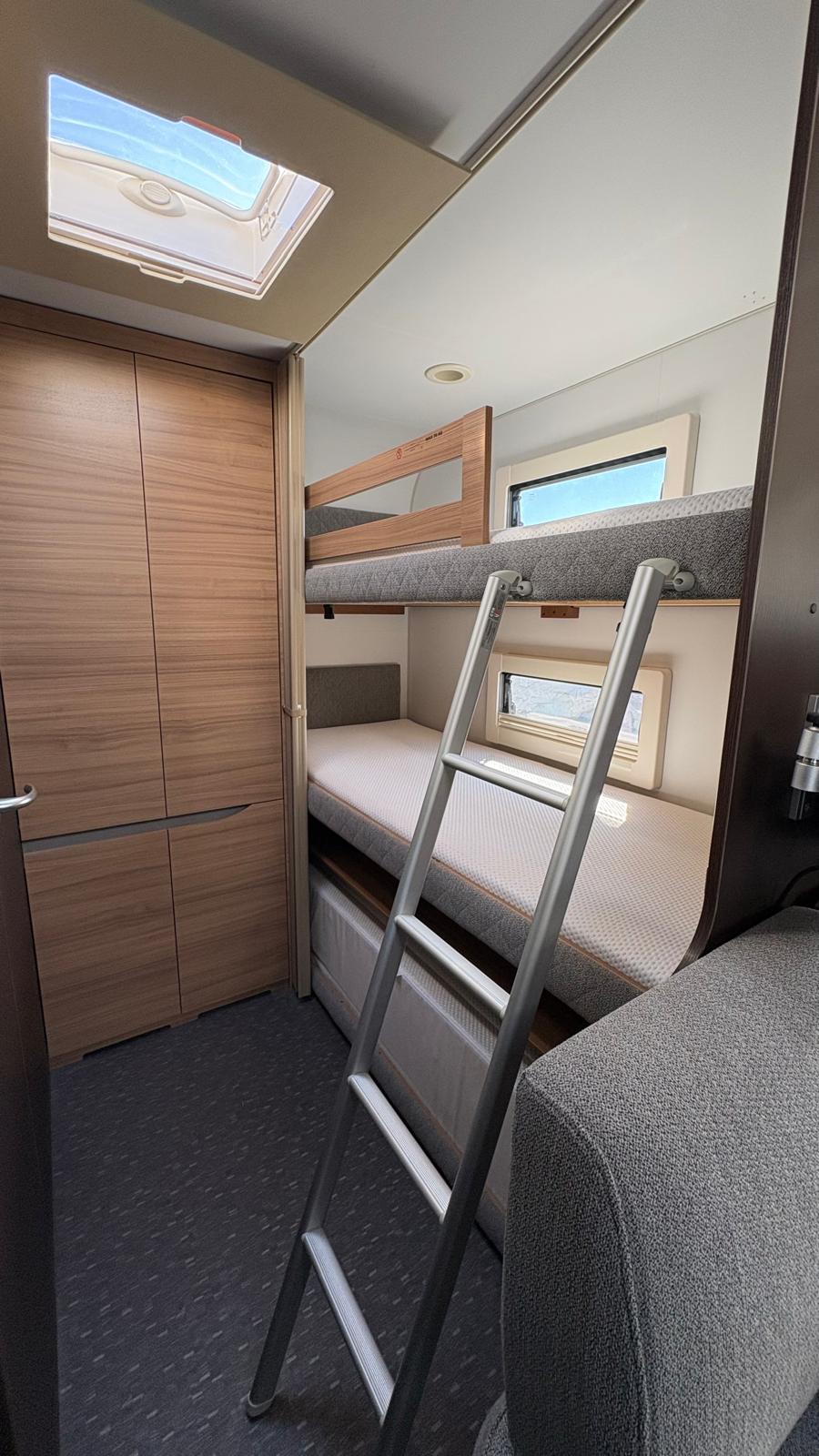 Queensbett im Bug, Mittelsitzgruppe (kann zu einem Bett umgebaut werden), 3er Stockbett im Heck, Antischlingerkupplung, alle Fenster ausstellbar mit Fliegengitter und Verdunkelungsrollo, Serviceklappe unter dem Stockbett, großer Kühlschrank, Fliegengittertür