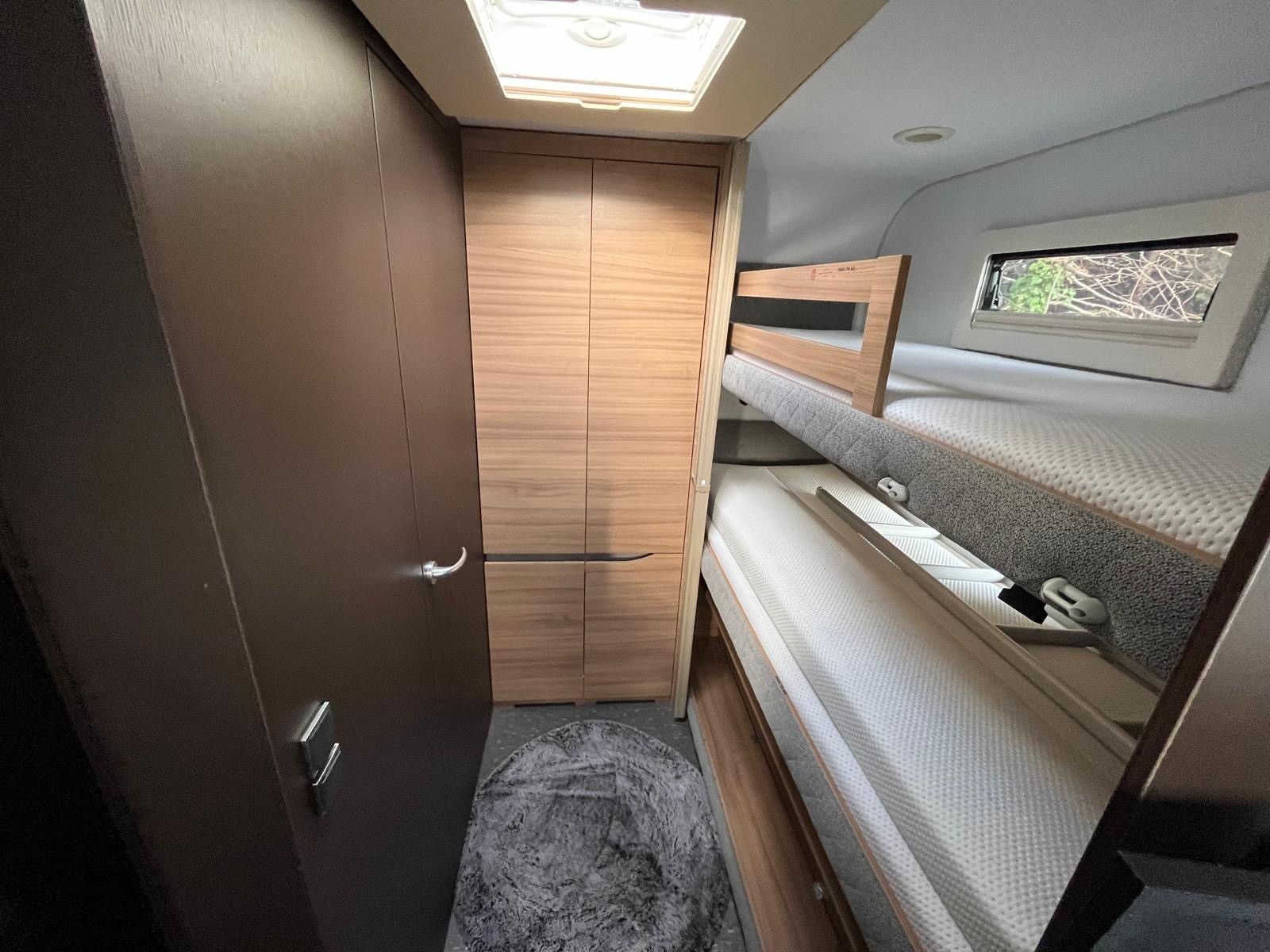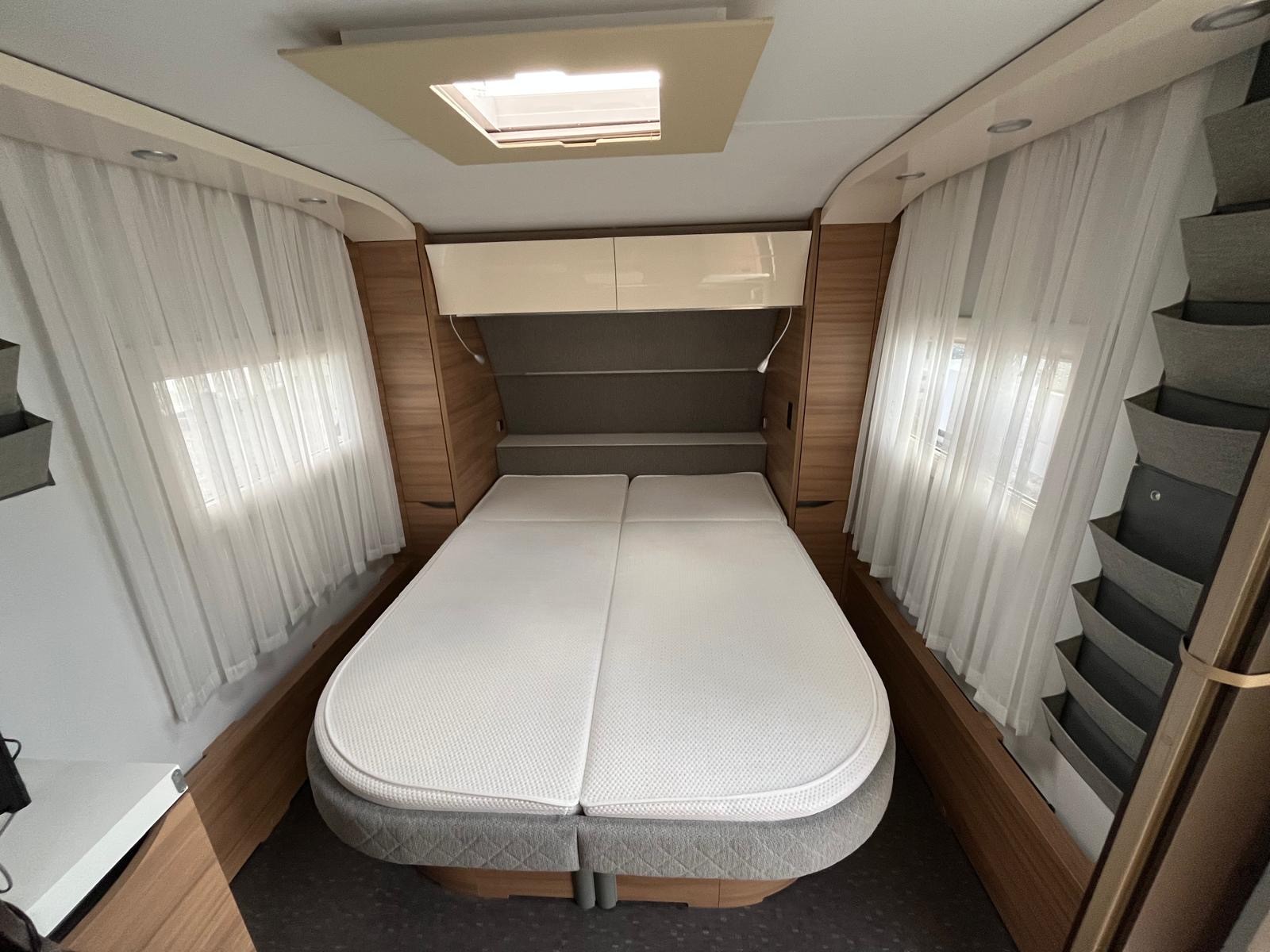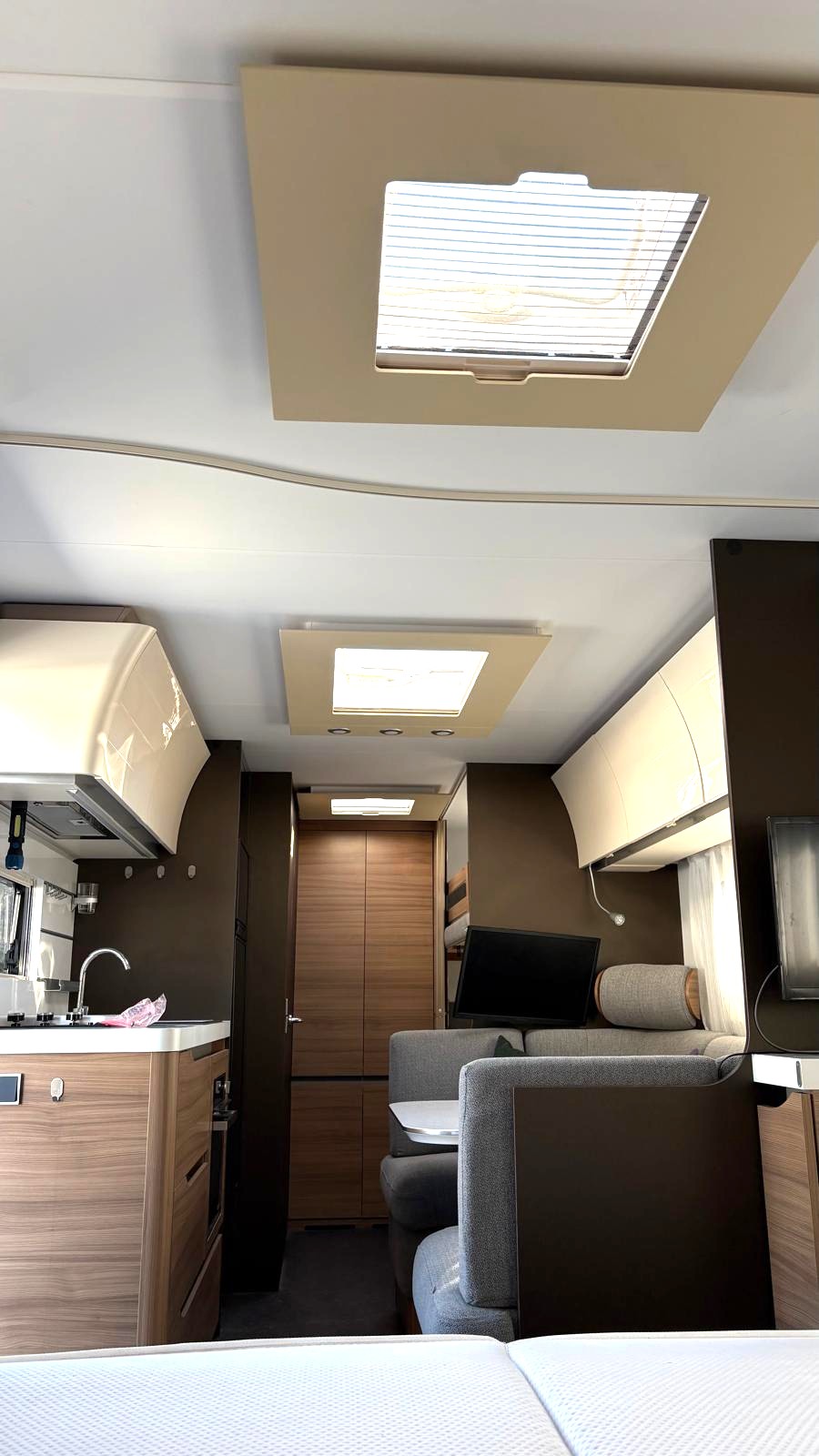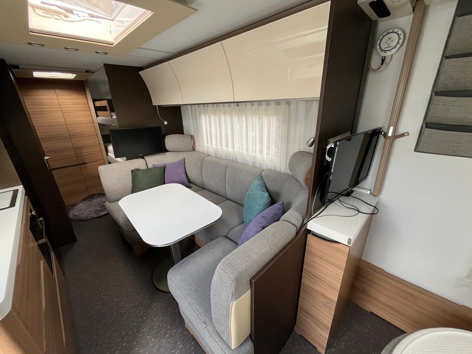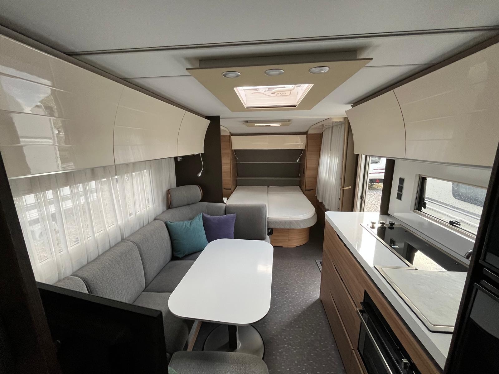 Queensbett im Bug, Mittelsitzgruppe (kann zu einem Bett umgebaut werden), 3er Stockbett im Heck, Antischlingerkupplung, alle Fenster ausstellbar mit Fliegengitter und Verdunkelungsrollo, Serviceklappe unter dem Stockbett, großer Kühlschrank, Fliegengittertür