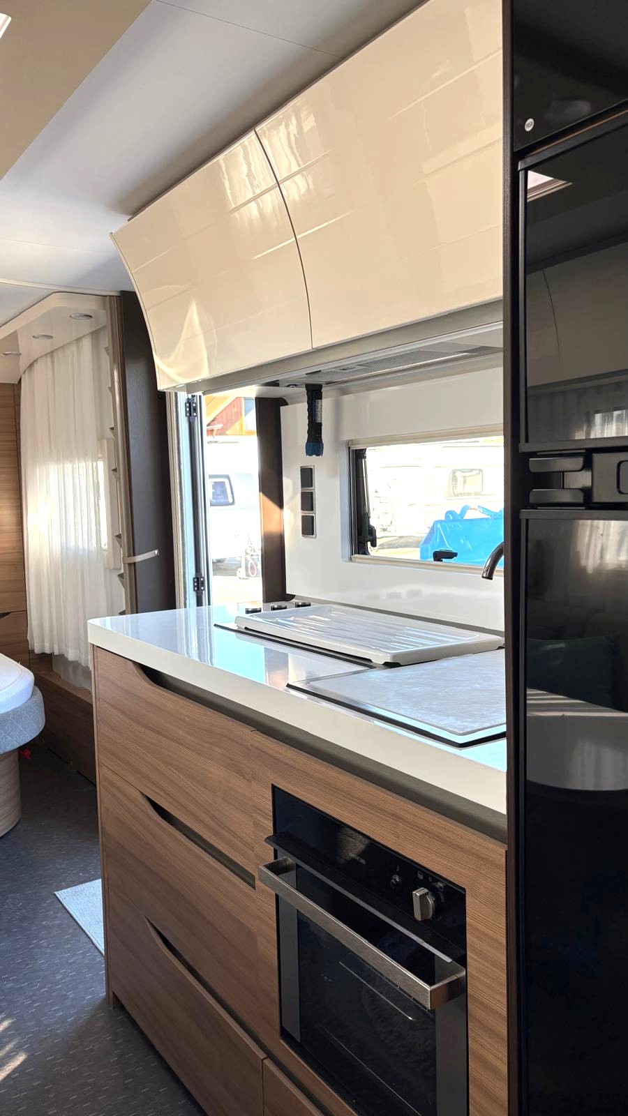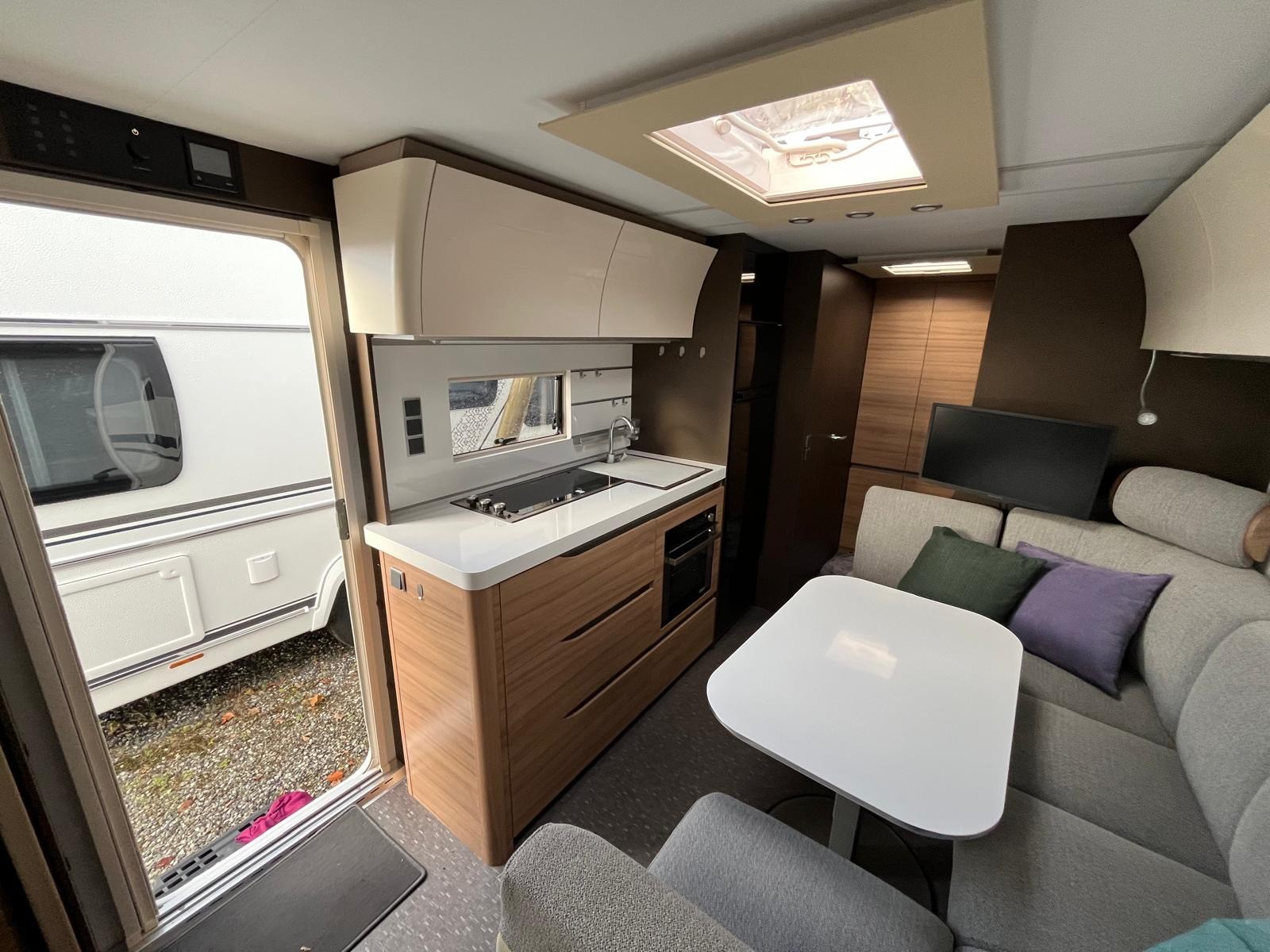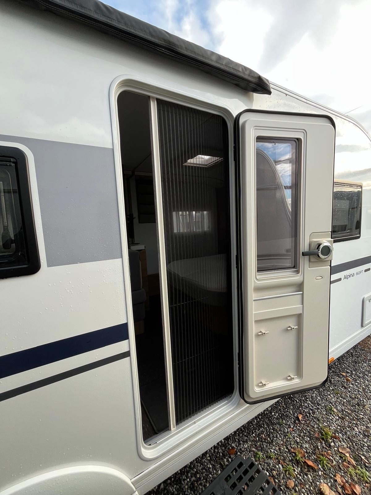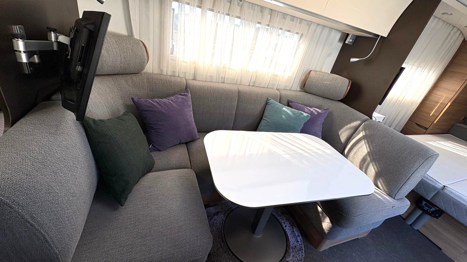 Queensbett im Bug, Mittelsitzgruppe (kann zu einem Bett umgebaut werden), 3er Stockbett im Heck, Antischlingerkupplung, alle Fenster ausstellbar mit Fliegengitter und Verdunkelungsrollo, Serviceklappe unter dem Stockbett, großer Kühlschrank, Fliegengittertür