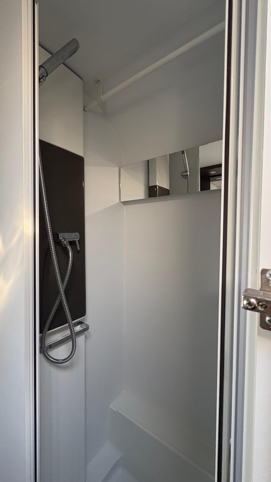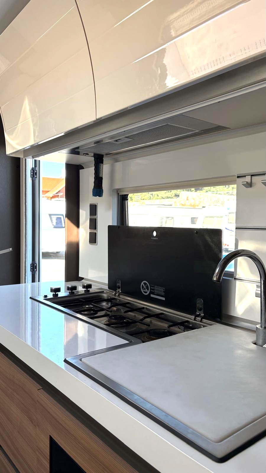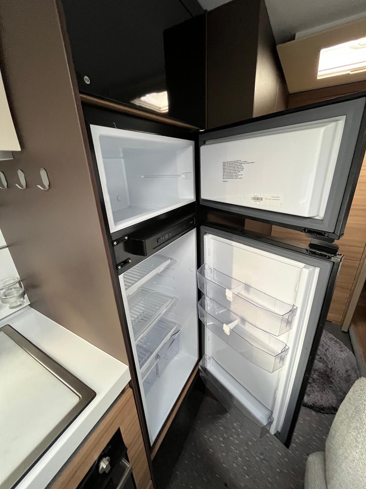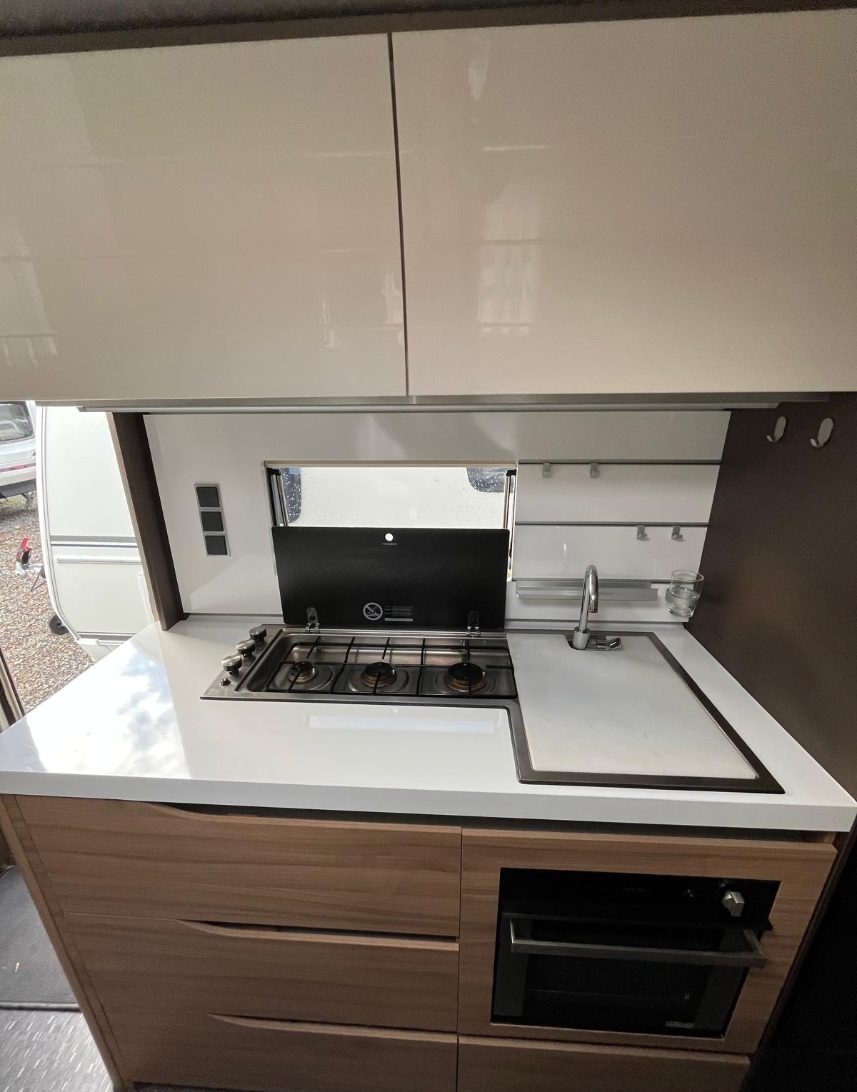 Queensbett im Bug, Mittelsitzgruppe (kann zu einem Bett umgebaut werden), 3er Stockbett im Heck, Antischlingerkupplung, alle Fenster ausstellbar mit Fliegengitter und Verdunkelungsrollo, Serviceklappe unter dem Stockbett, großer Kühlschrank, Fliegengittertür