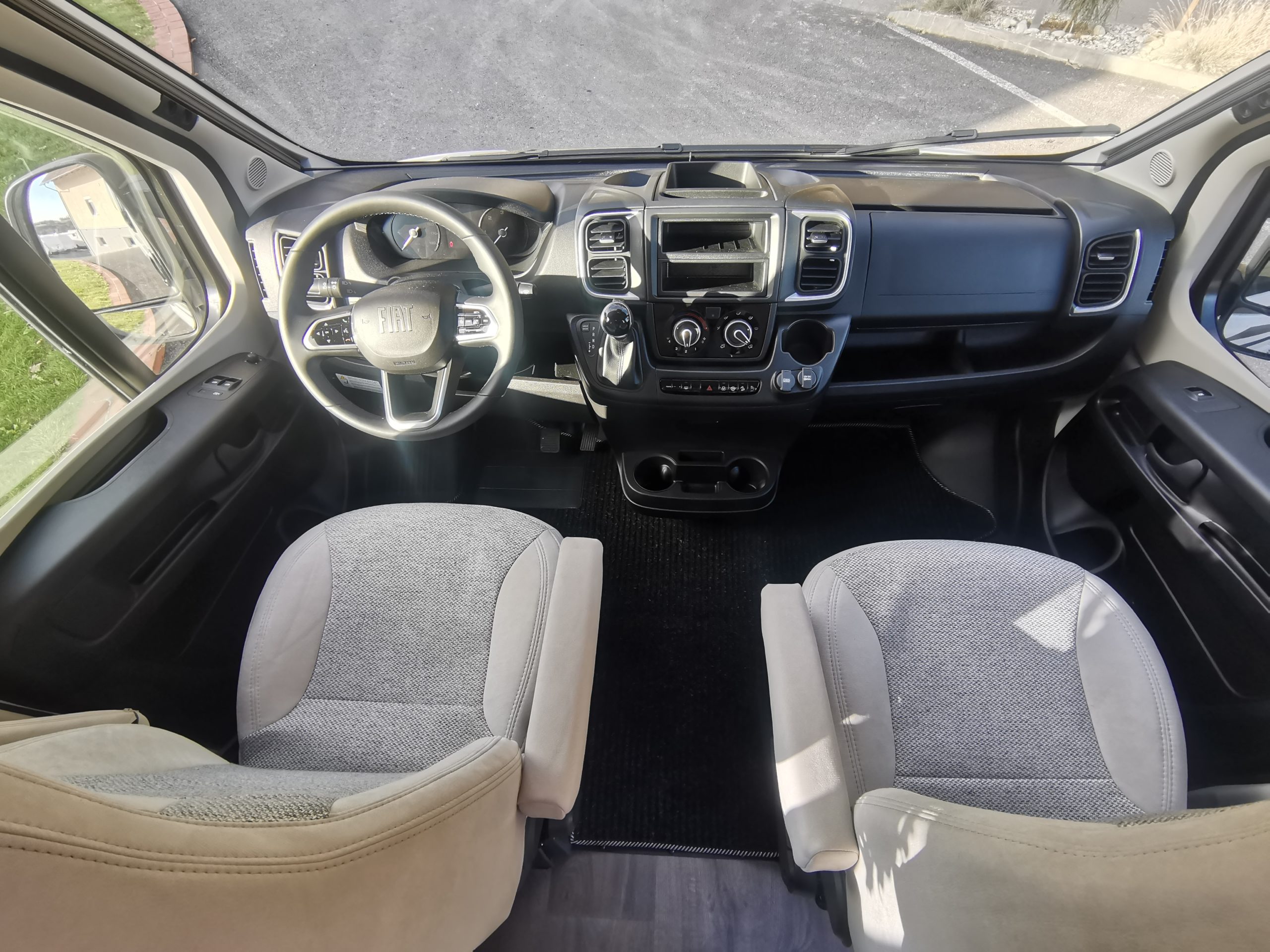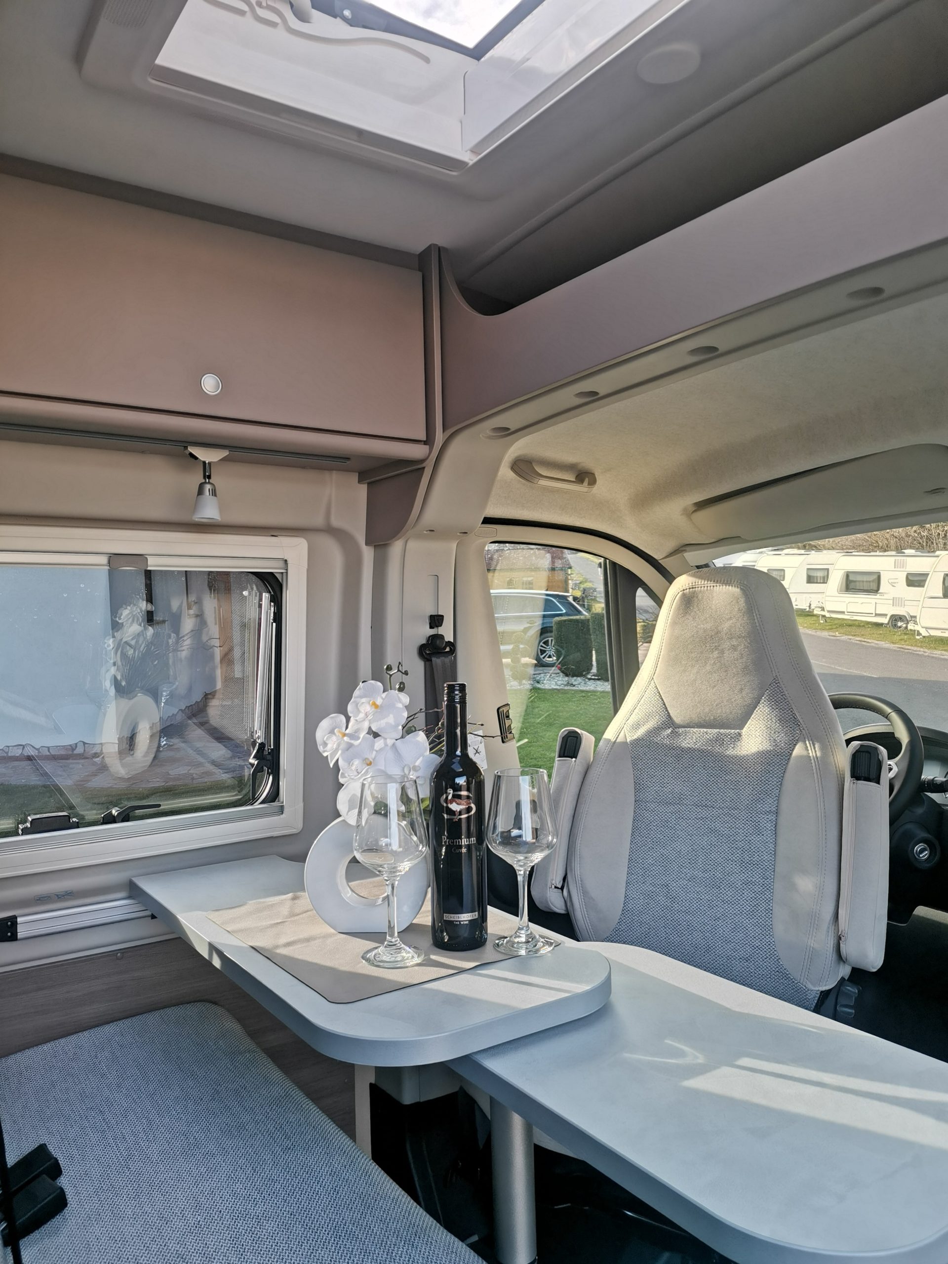 Dachhaube Midi-Heki 70×50 cm über Sitzgruppe, Duschausstattung( Brausekopf ausziehbar, Duschvorhang, Führungsschiene, Brausehalter), Fenster im Bad, Kleiderstange in der Nasszelle, Breite Einstiegstufe, Drehplatte für Tischerweiterung an der Sitzgruppe)
