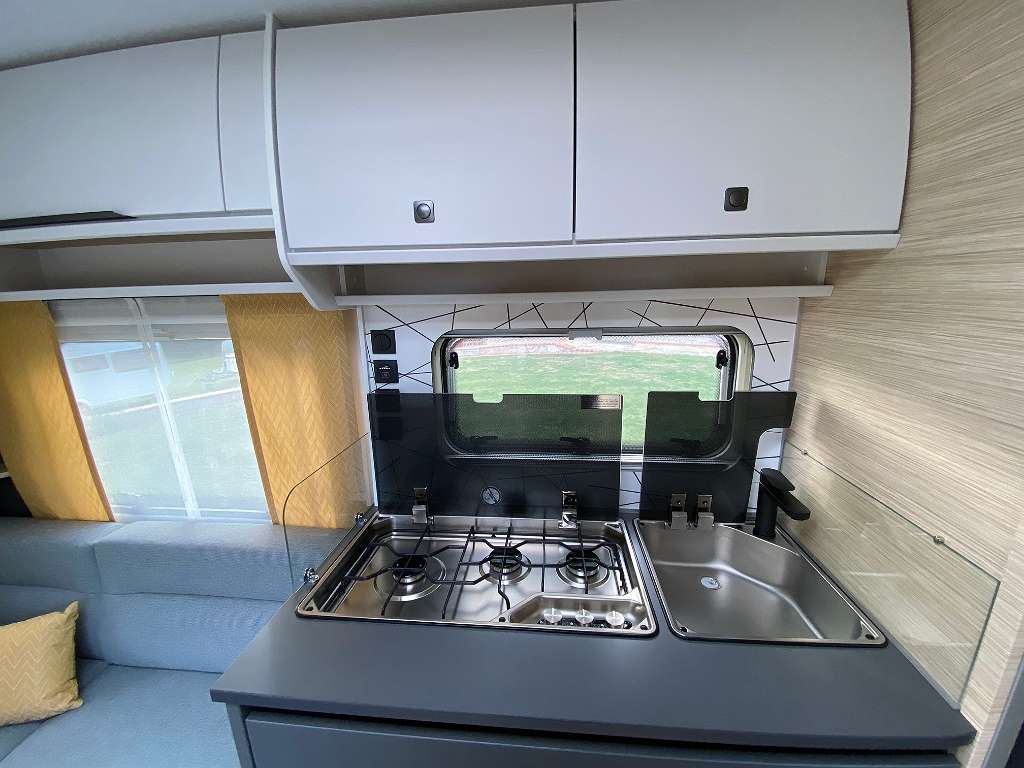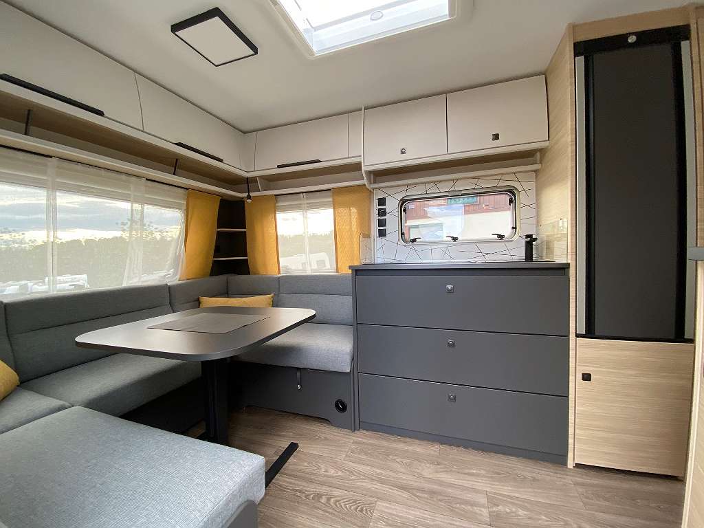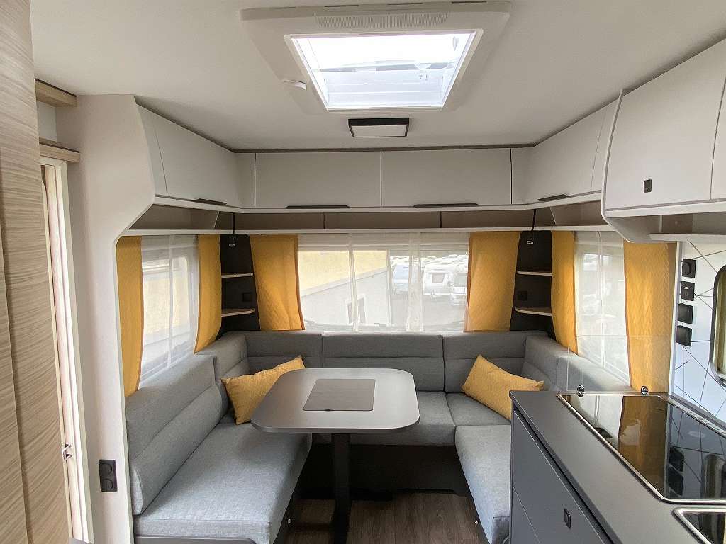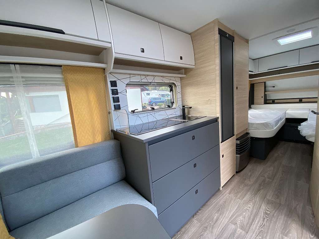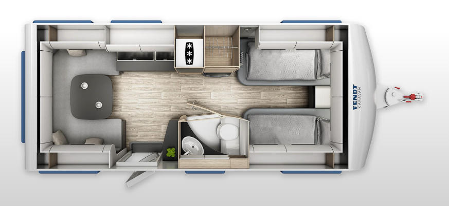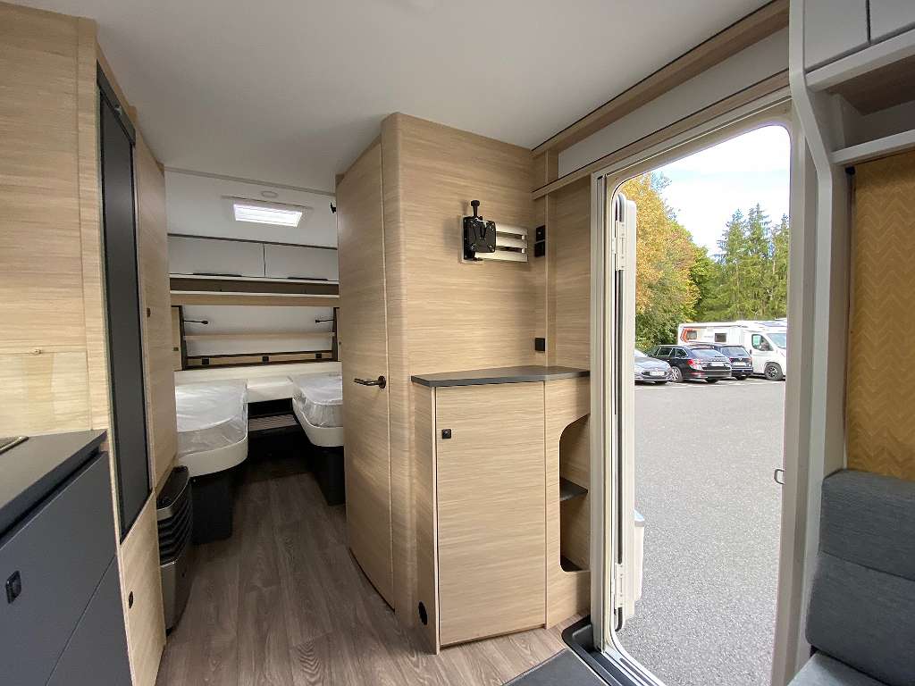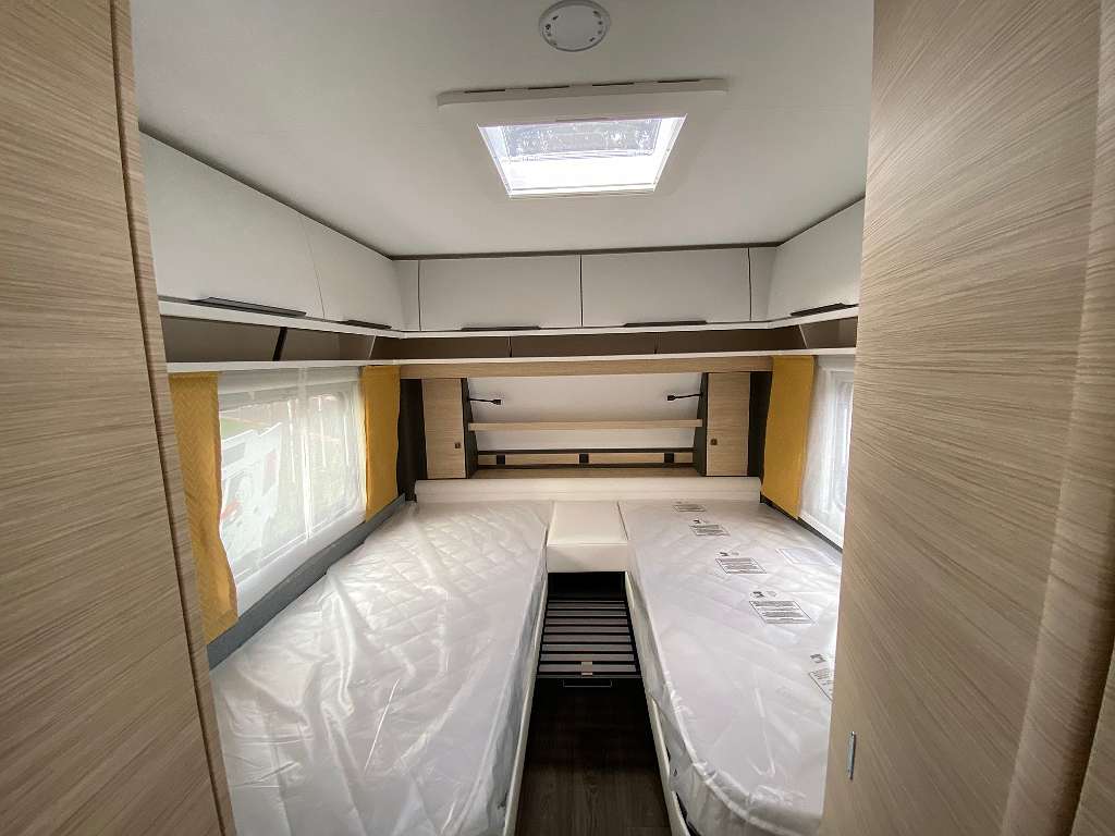 Einzelbetten mit Rollbettfunktion Bug , Rundsitzgruppe (kann zu einem Bett umgebaut werden), alle Fenster sind ausstellbar mit Fliegengitter und Verdunklungsrollo, Antischlingerkupplung, Serviceklappe unter dem Bett, 25l Frischwassertank, Truma Gasheizung S3004, Fliegengittertür Eingang