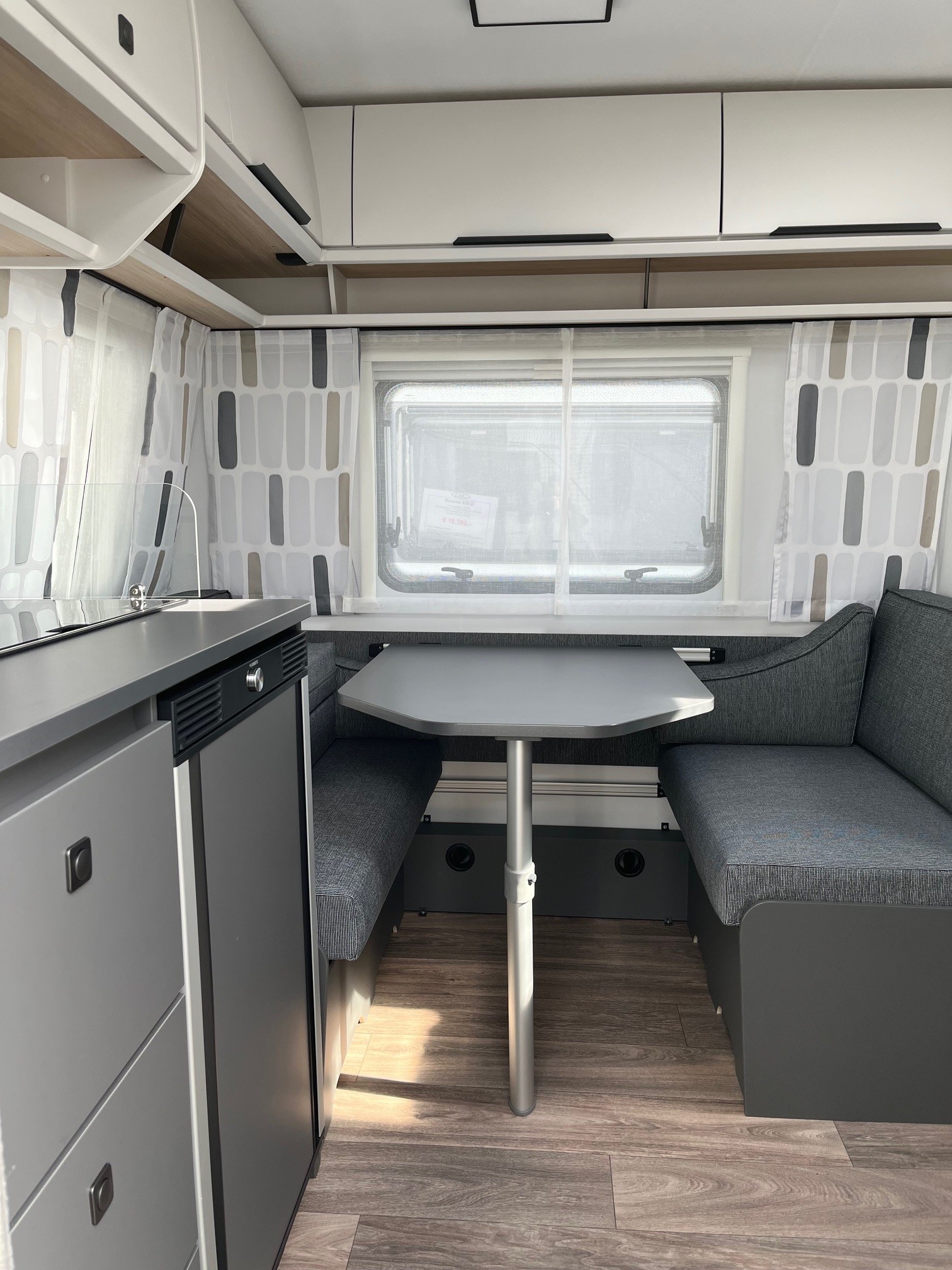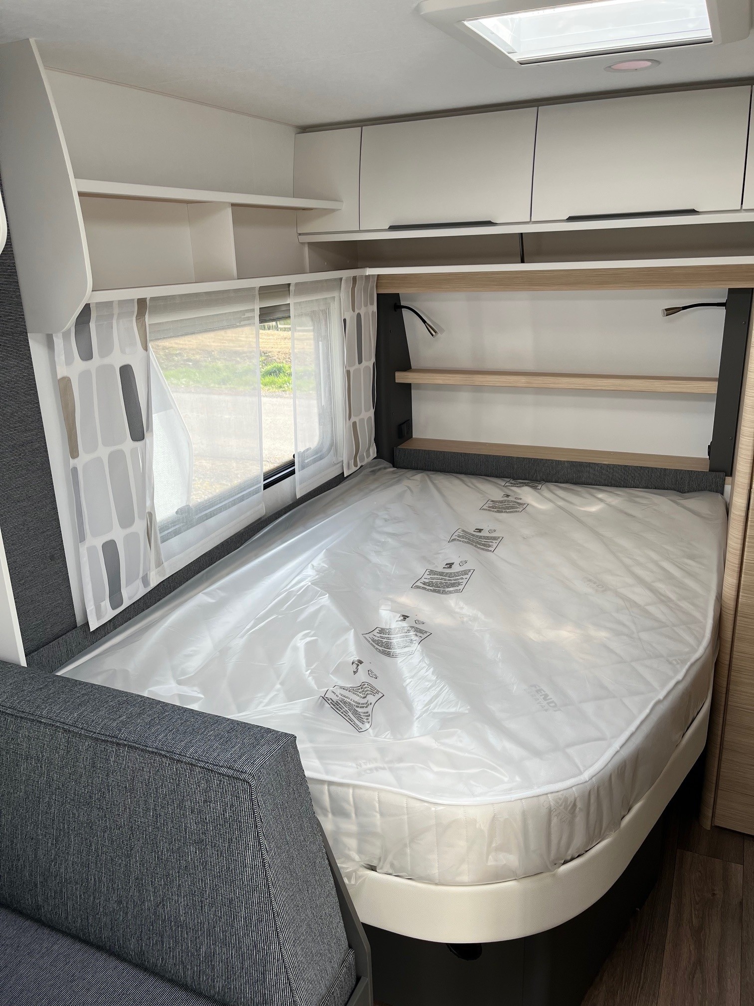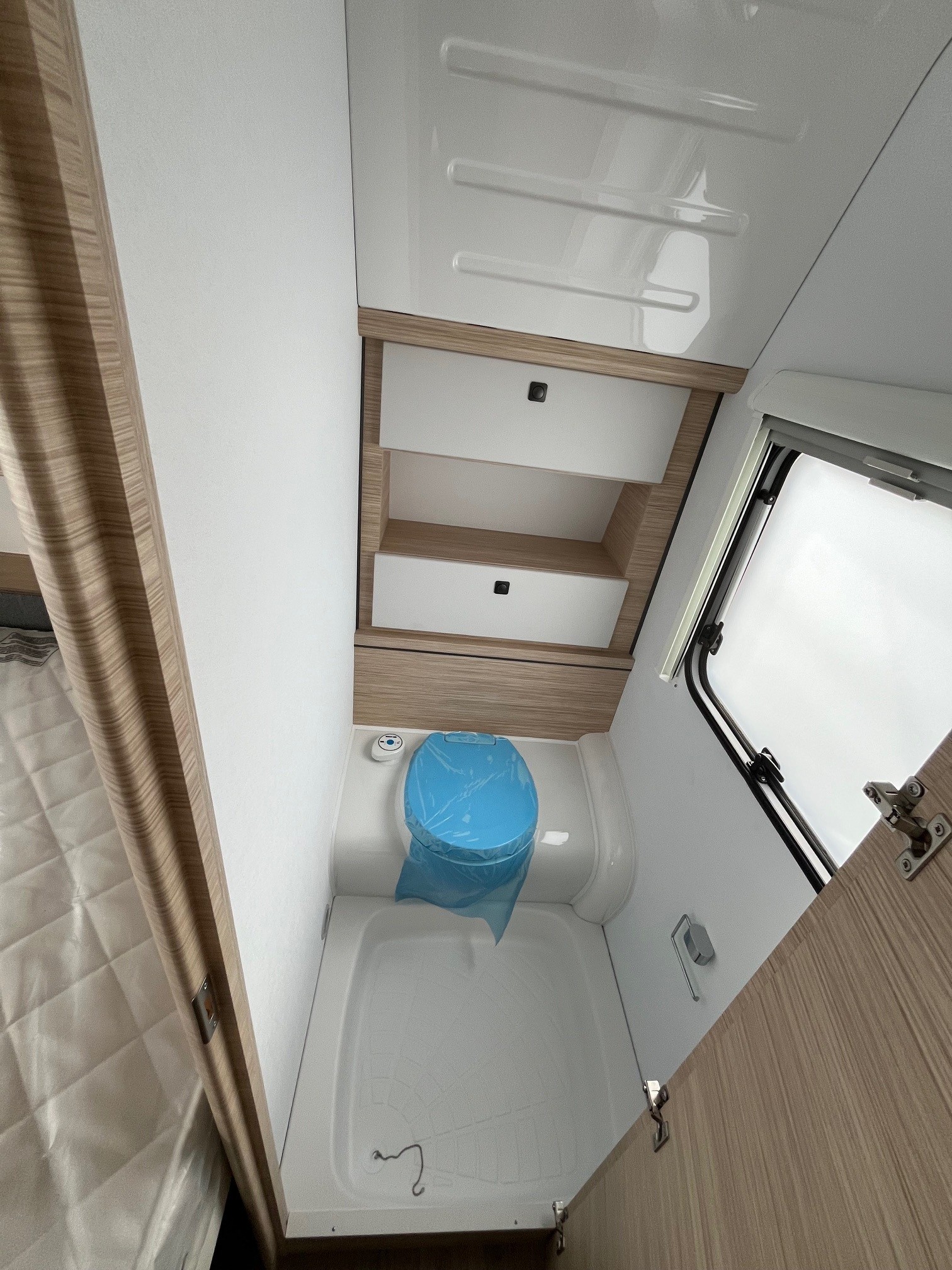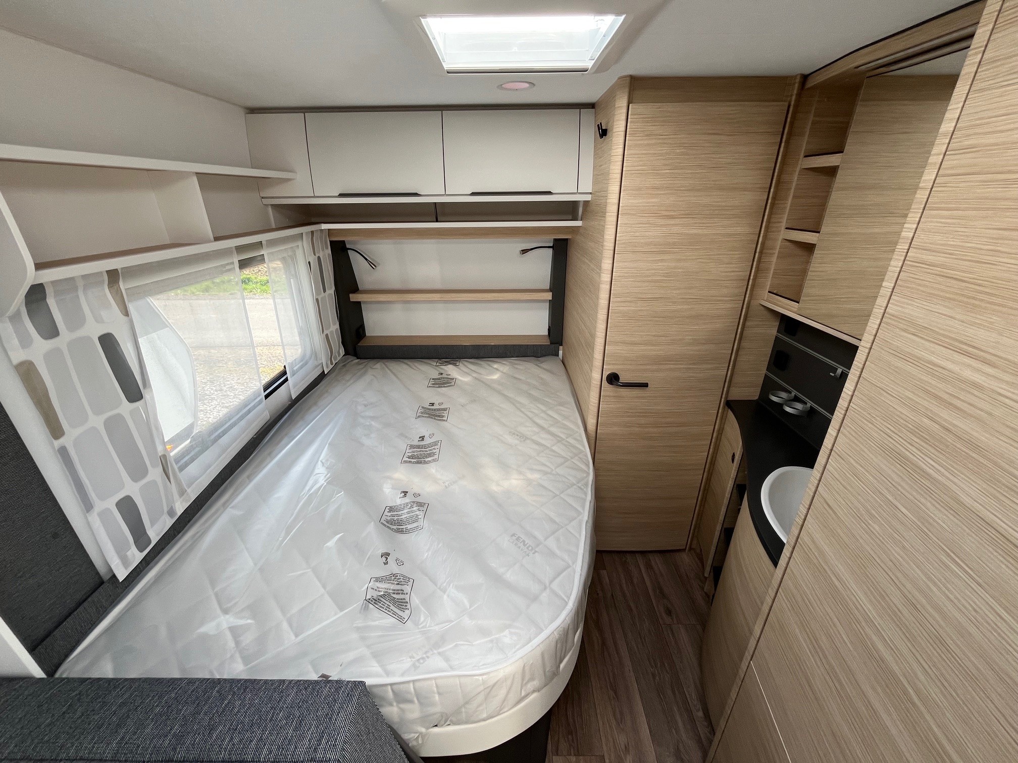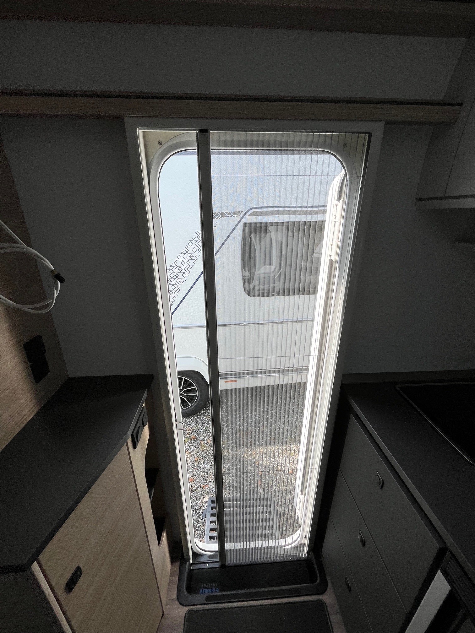 • Eingangstür mit integriertem und isoliertem Einstieg und Ablage im oberen Eingangstürbereich getöntes Fenster und Verdunkelungsplissee
