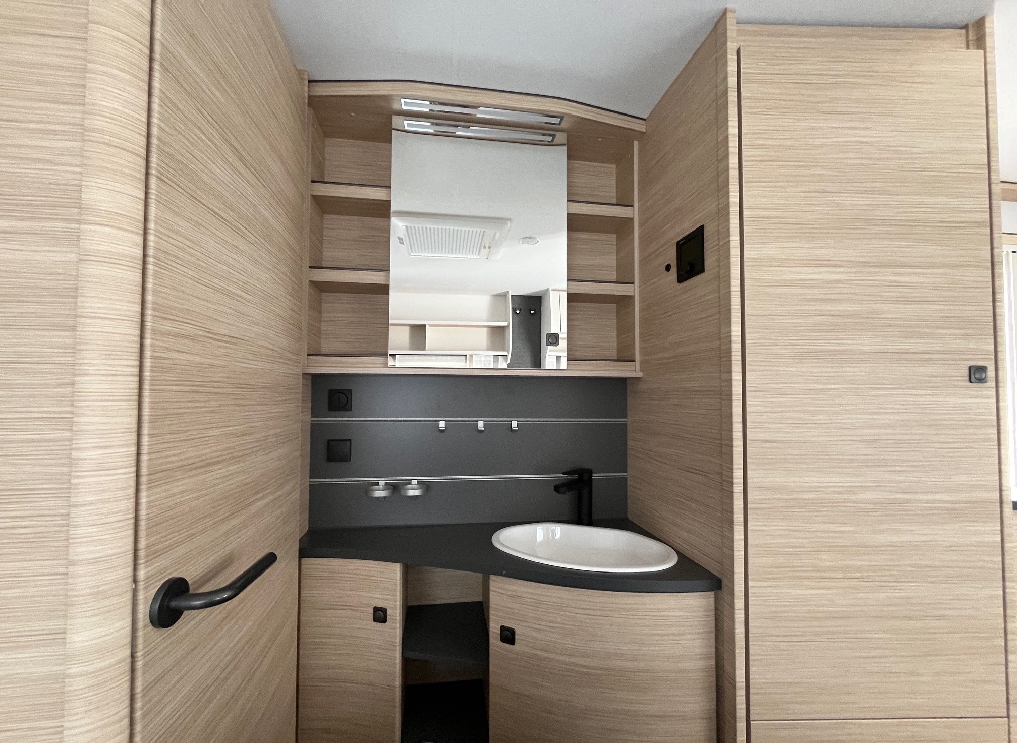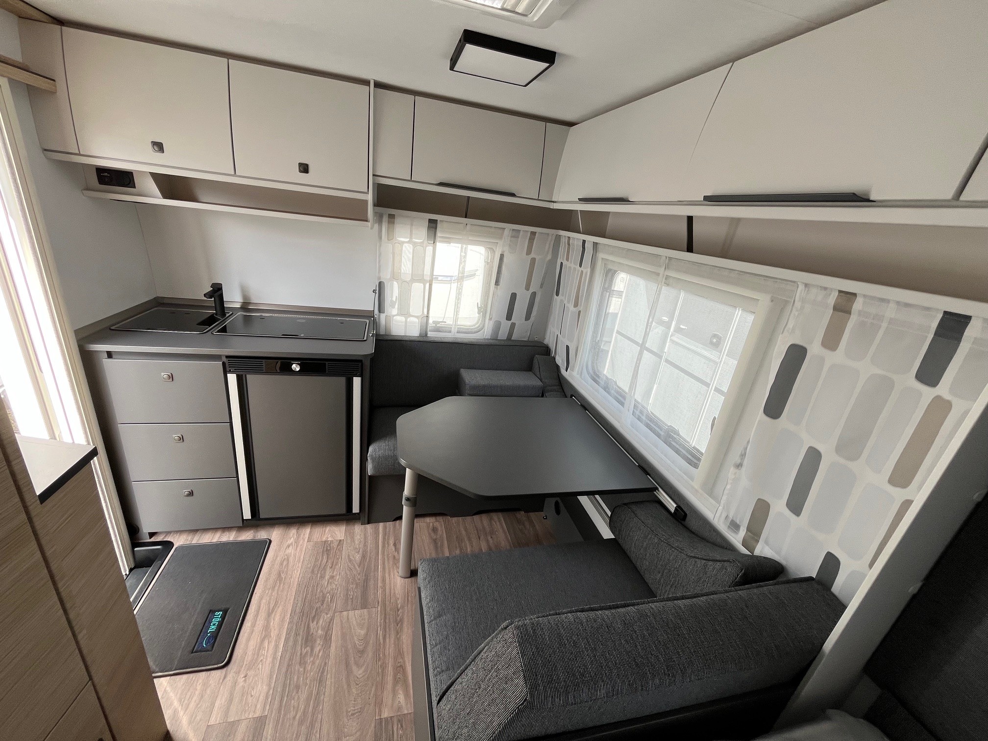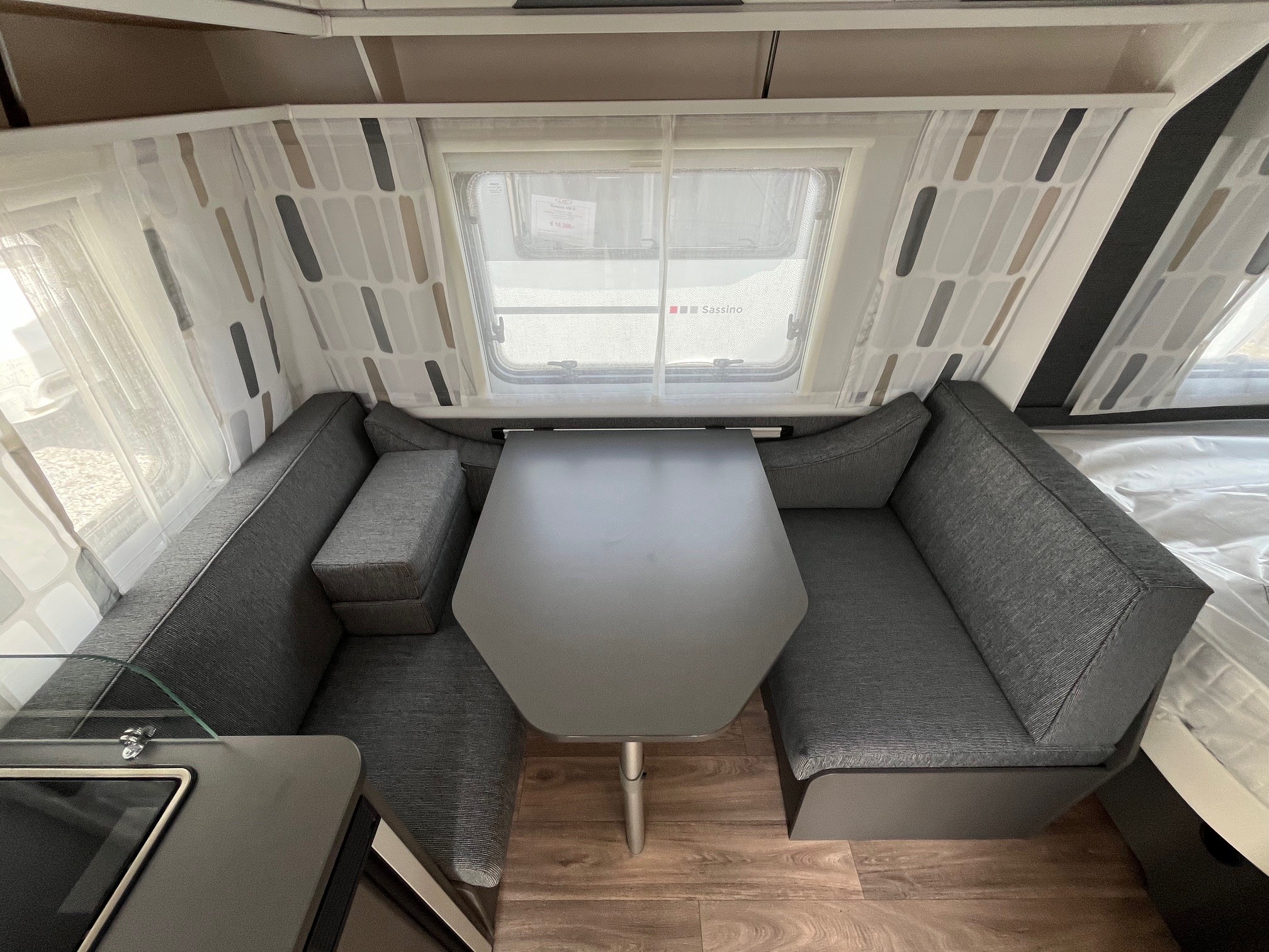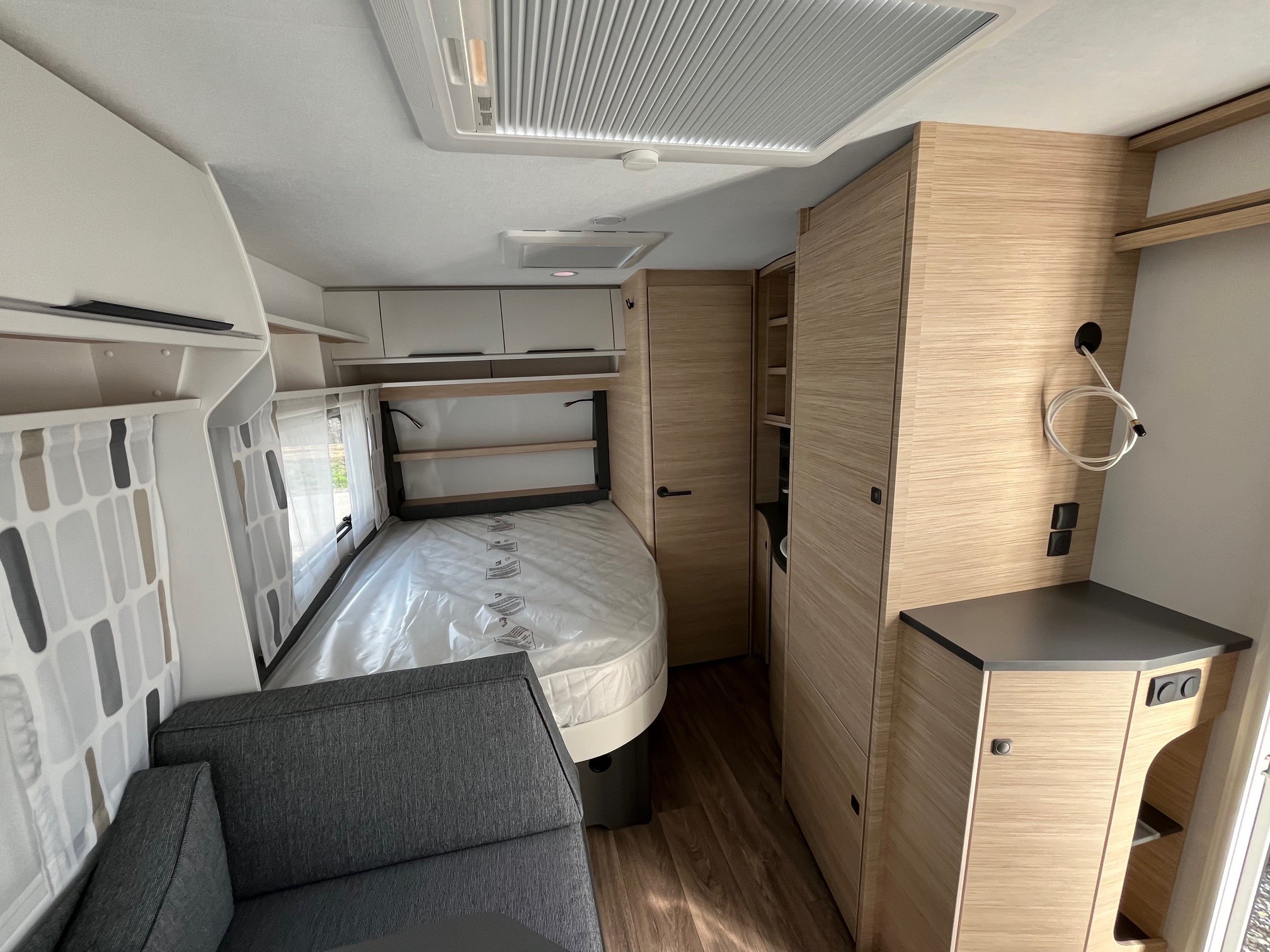 • Eingangstür mit integriertem und isoliertem Einstieg und Ablage im oberen Eingangstürbereich getöntes Fenster und Verdunkelungsplissee