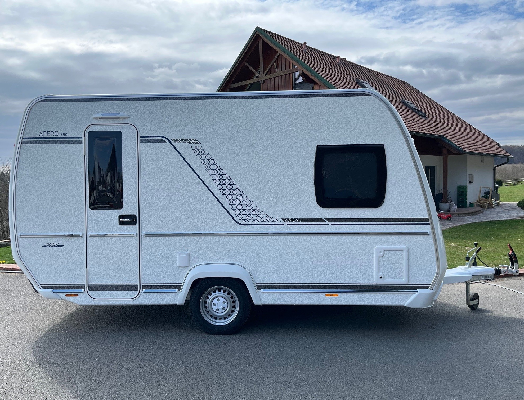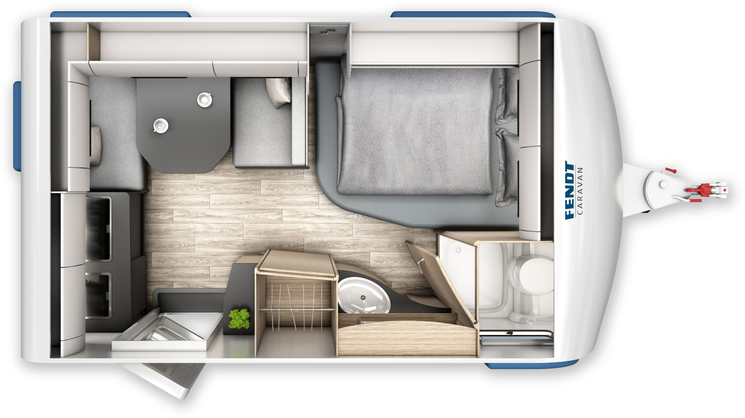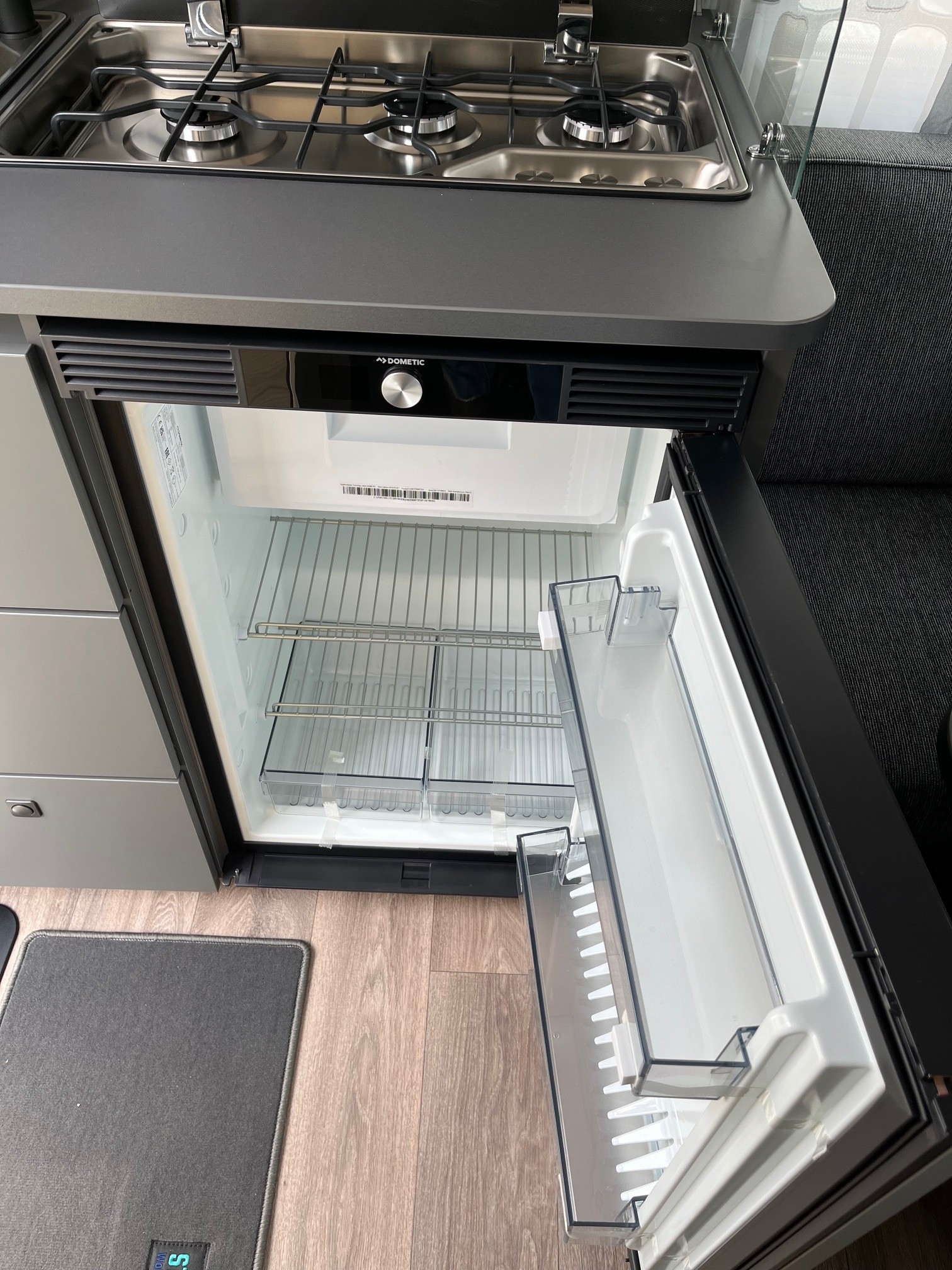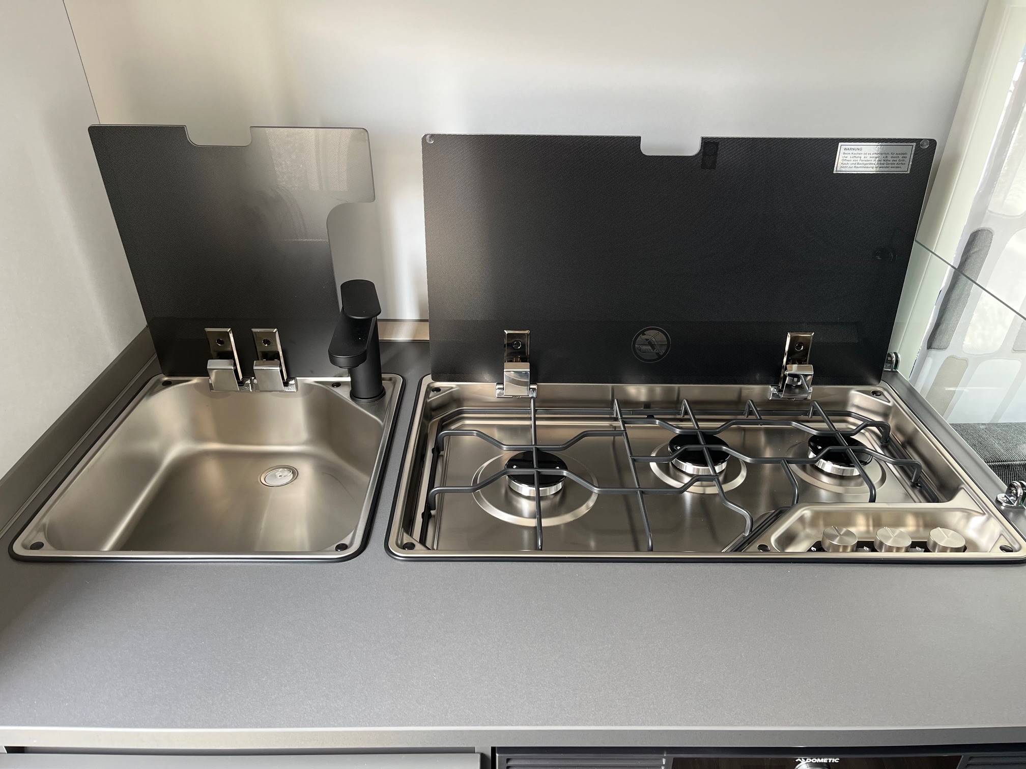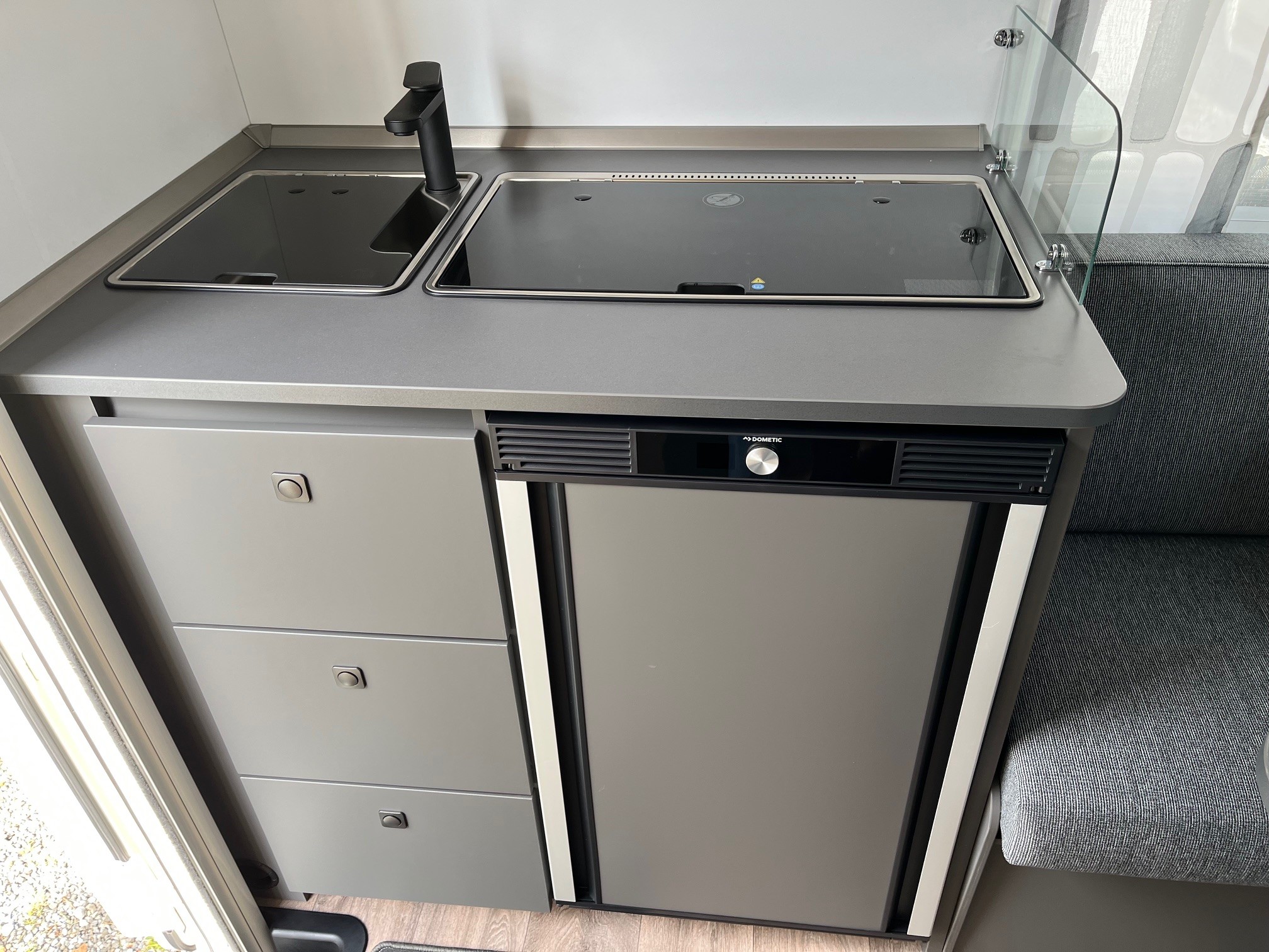 • Eingangstür mit integriertem und isoliertem Einstieg und Ablage im oberen Eingangstürbereich getöntes Fenster und Verdunkelungsplissee