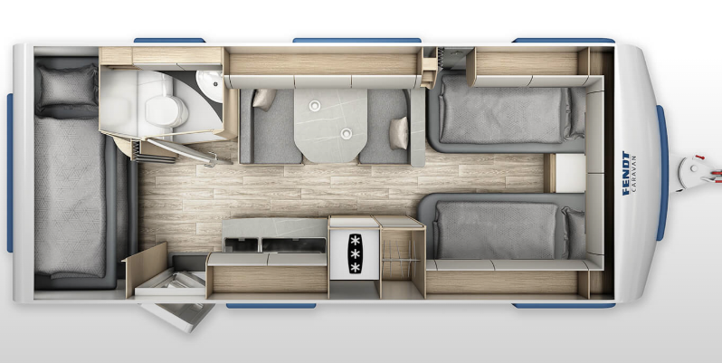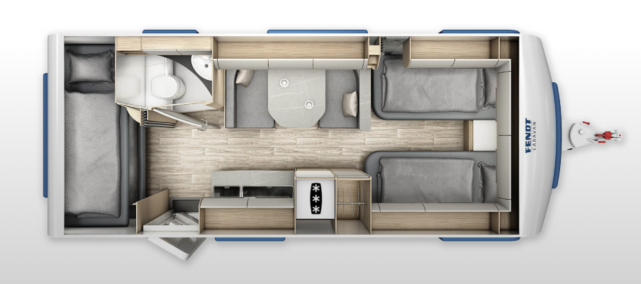Einzelbetten im Bugbereich, 2er Stockbett im Heckbereich und Seitensitzgruppe mittig
