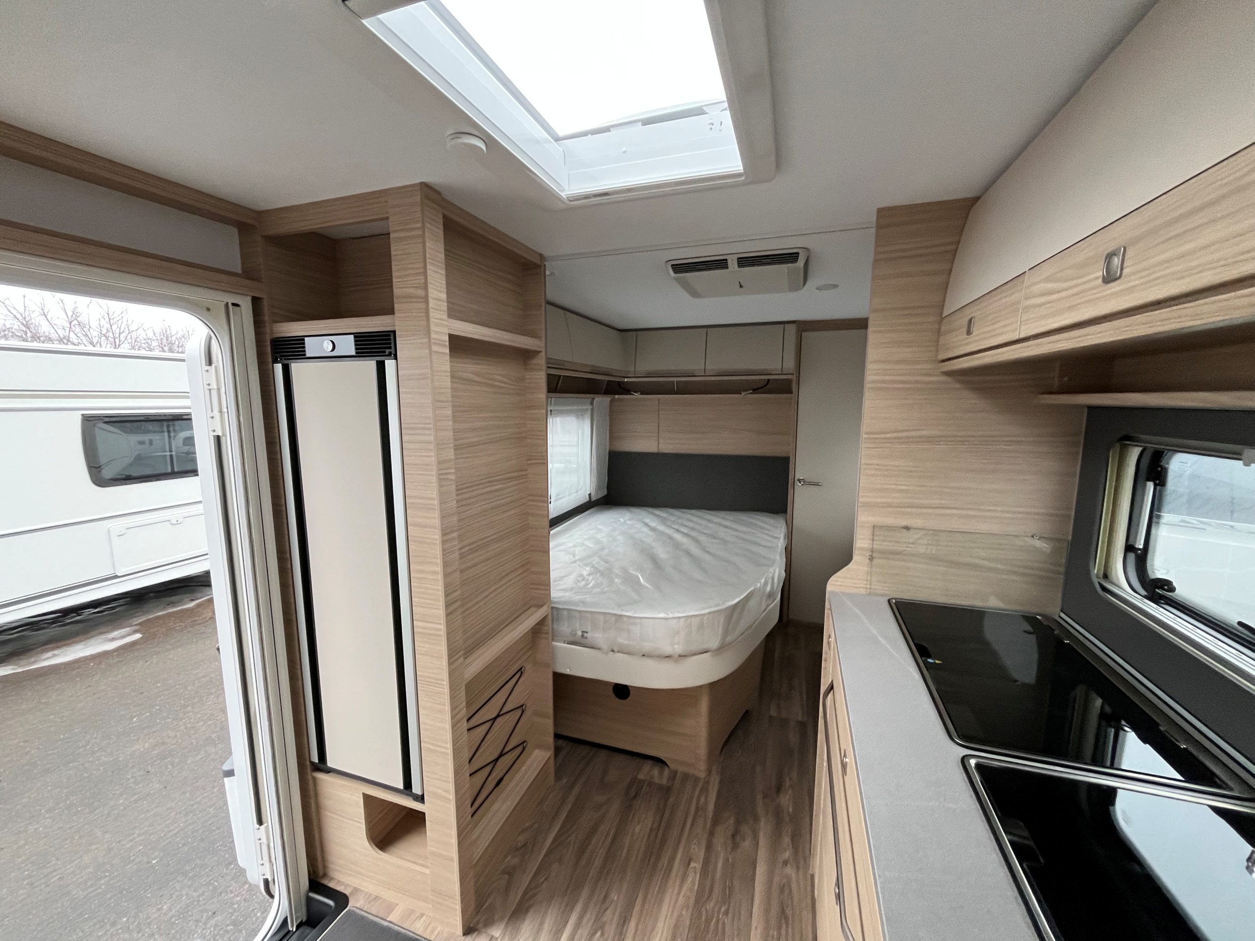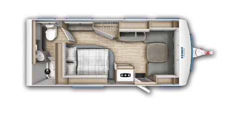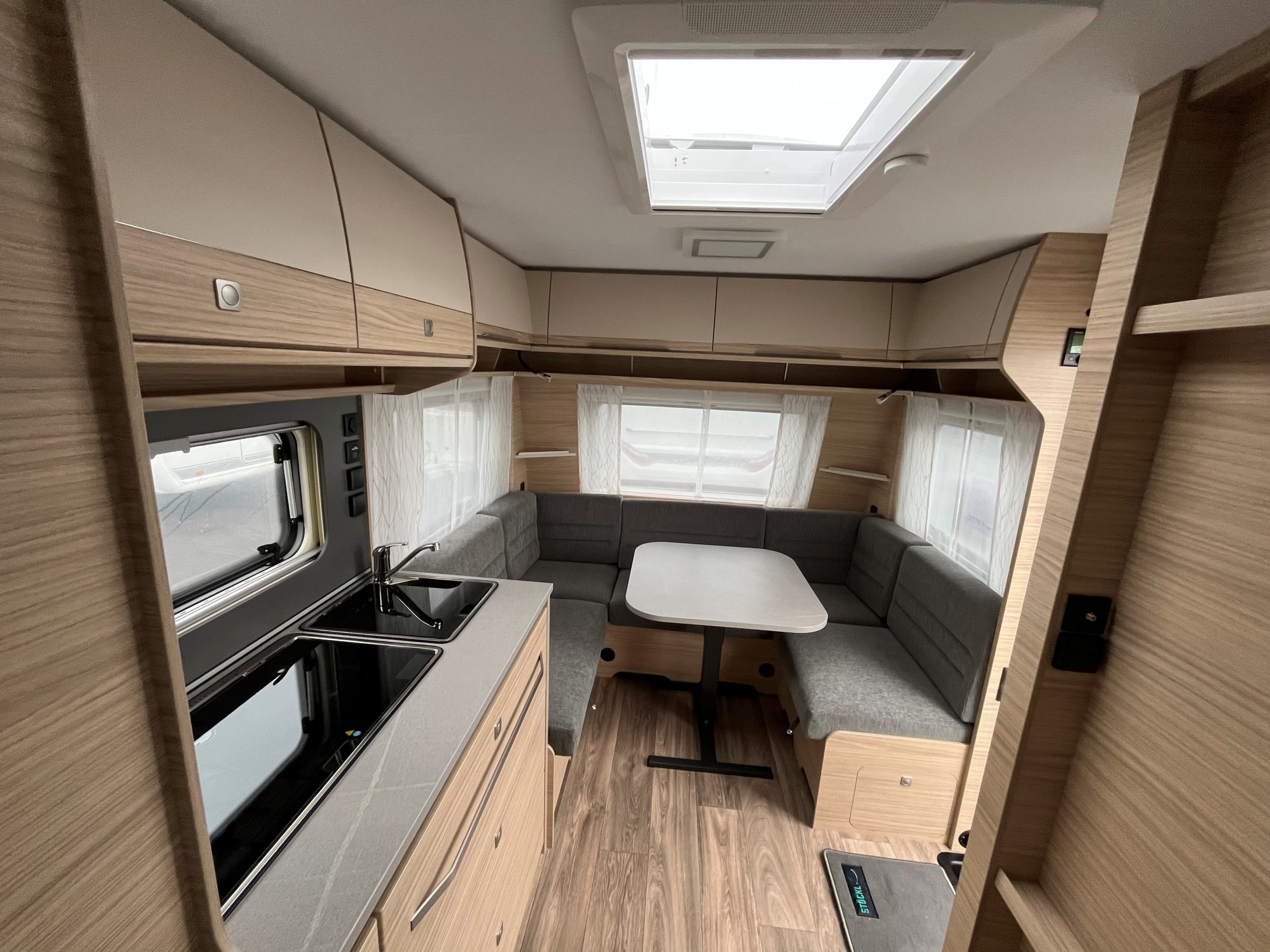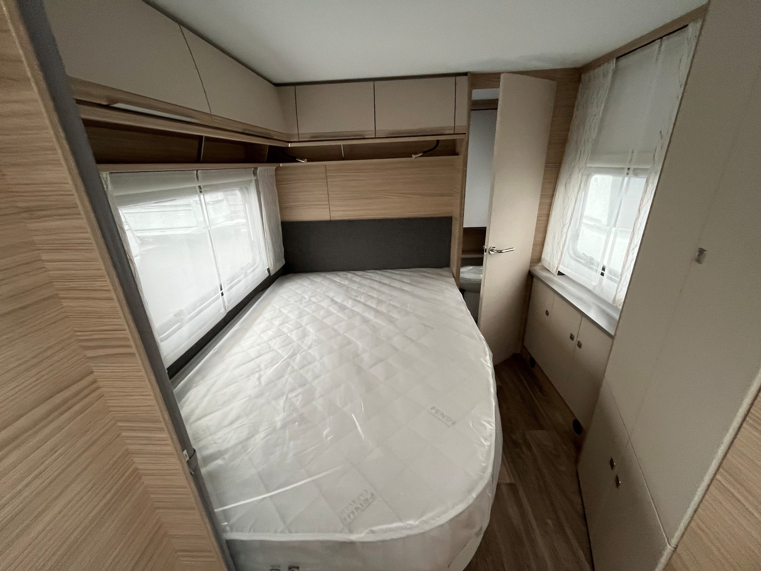 Französisches Bett, große Rundsitzgruppe im Bug (kann zu einem Bett umgebaut werden), alle Fenster ausstellbar mit Fliegengitter und Verdunkelungsrollo, Antischlingerkupplung, Serviceklappe unter dem Bett, Fliegengittertür, 25l Frischwassertank, Heizung Combi 6E