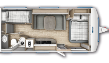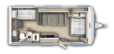 Querbett im Bugbereich, 2er Stockbett im Heckbereich und Mittelsitzgruppe mittig