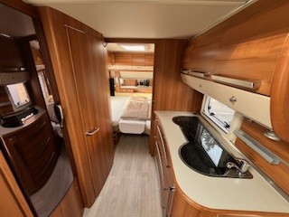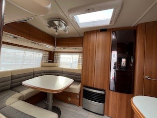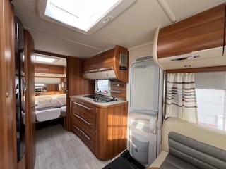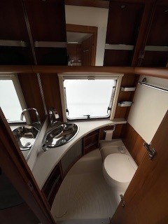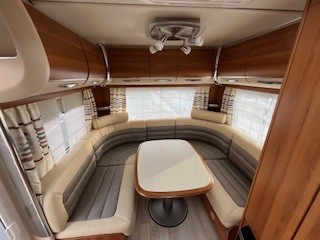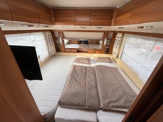 Einzelbetten, große Rundsitzgruppe im Heck (kann zu einem Bett umgebaut werden), alle Fenster ausstellbar mit Fliegengitter und Verdunkelungsrollo