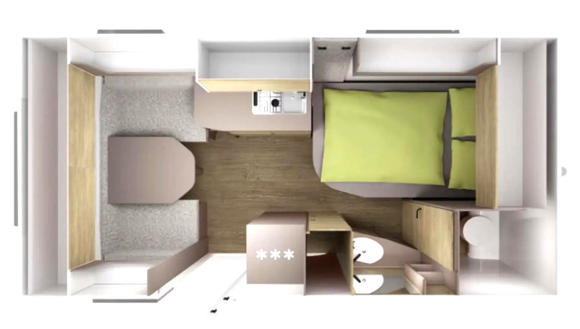 Französisches Bett im Bug, Seitensitzgruppe im Heck (kann zu einem Bett umgebaut werden), alle Fenster ausstellbar mit Fliegengitter und Verdunkelungsrollo, Umluftheizung, Frischwassertank 25l, Alufelgen schwarz