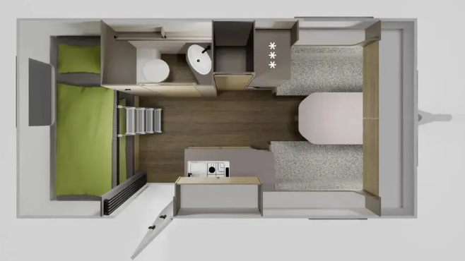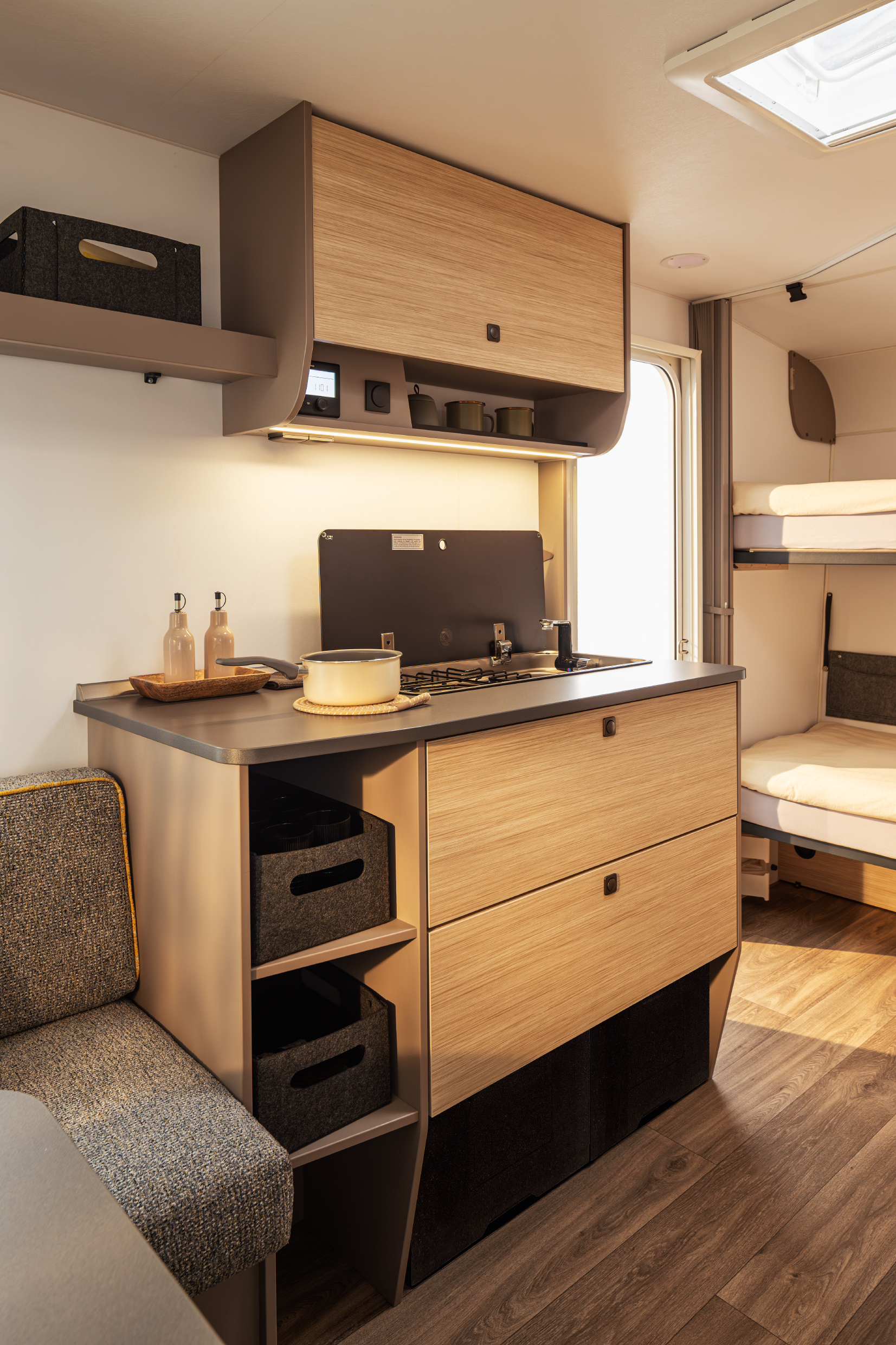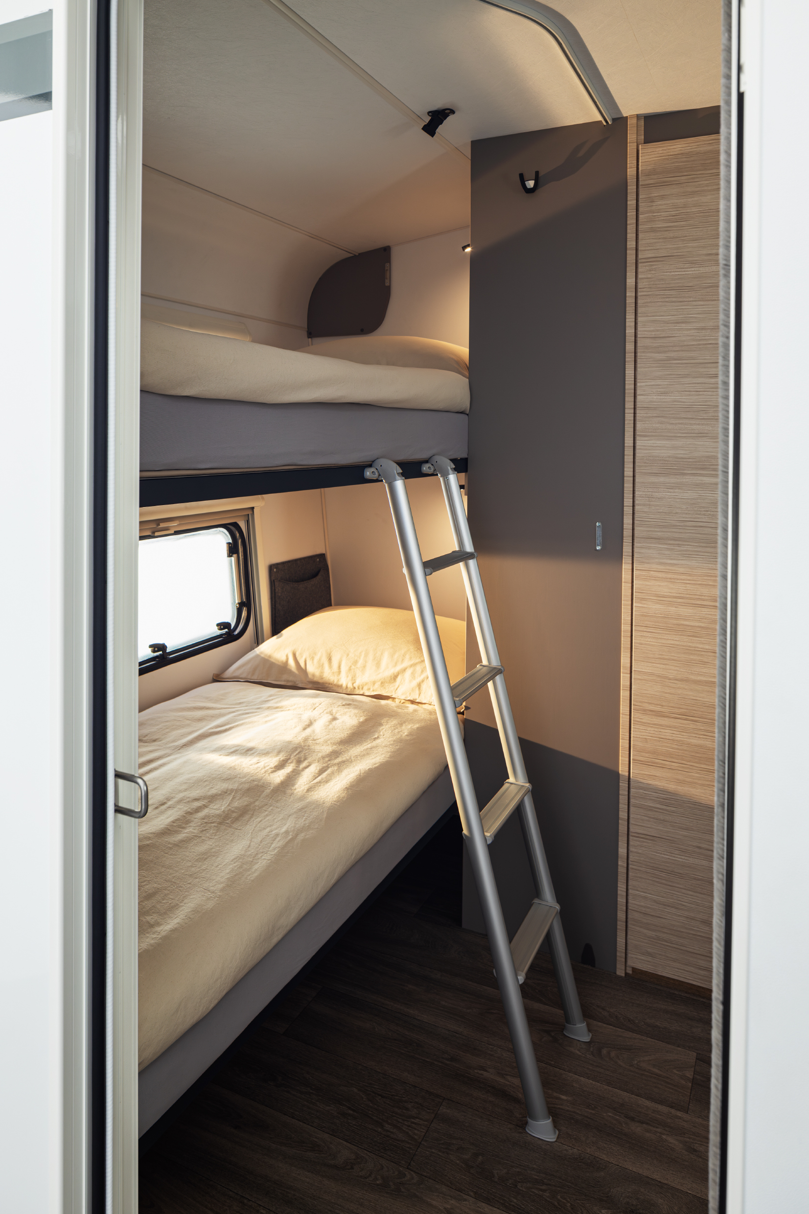 Seitensitzgruppe im Bug (kann zu einem Bett umgebaut werden), Stockbett im Heck, alle Fenster ausstellbar mit Fliegengitter und Verdunkelungsrollo