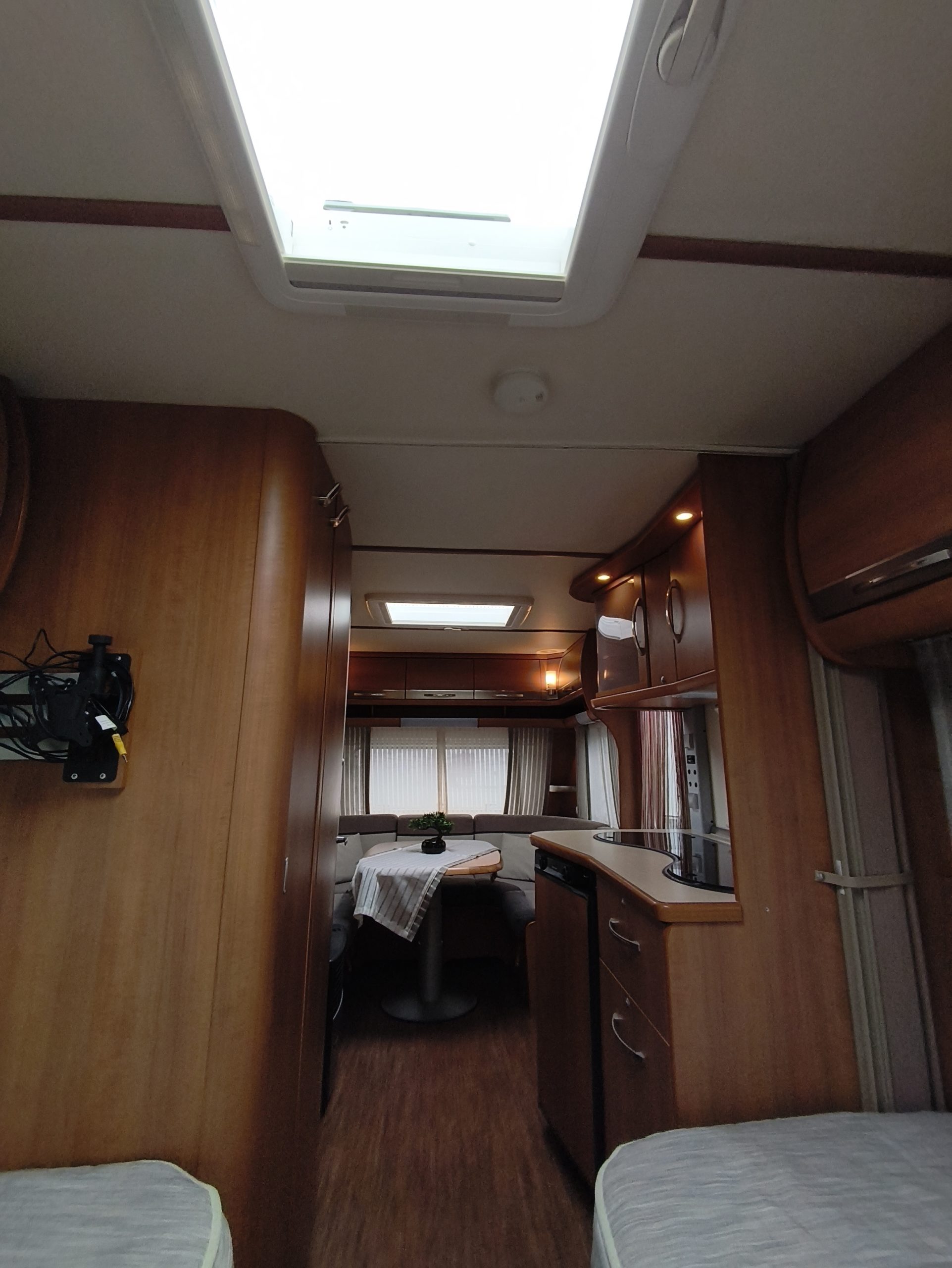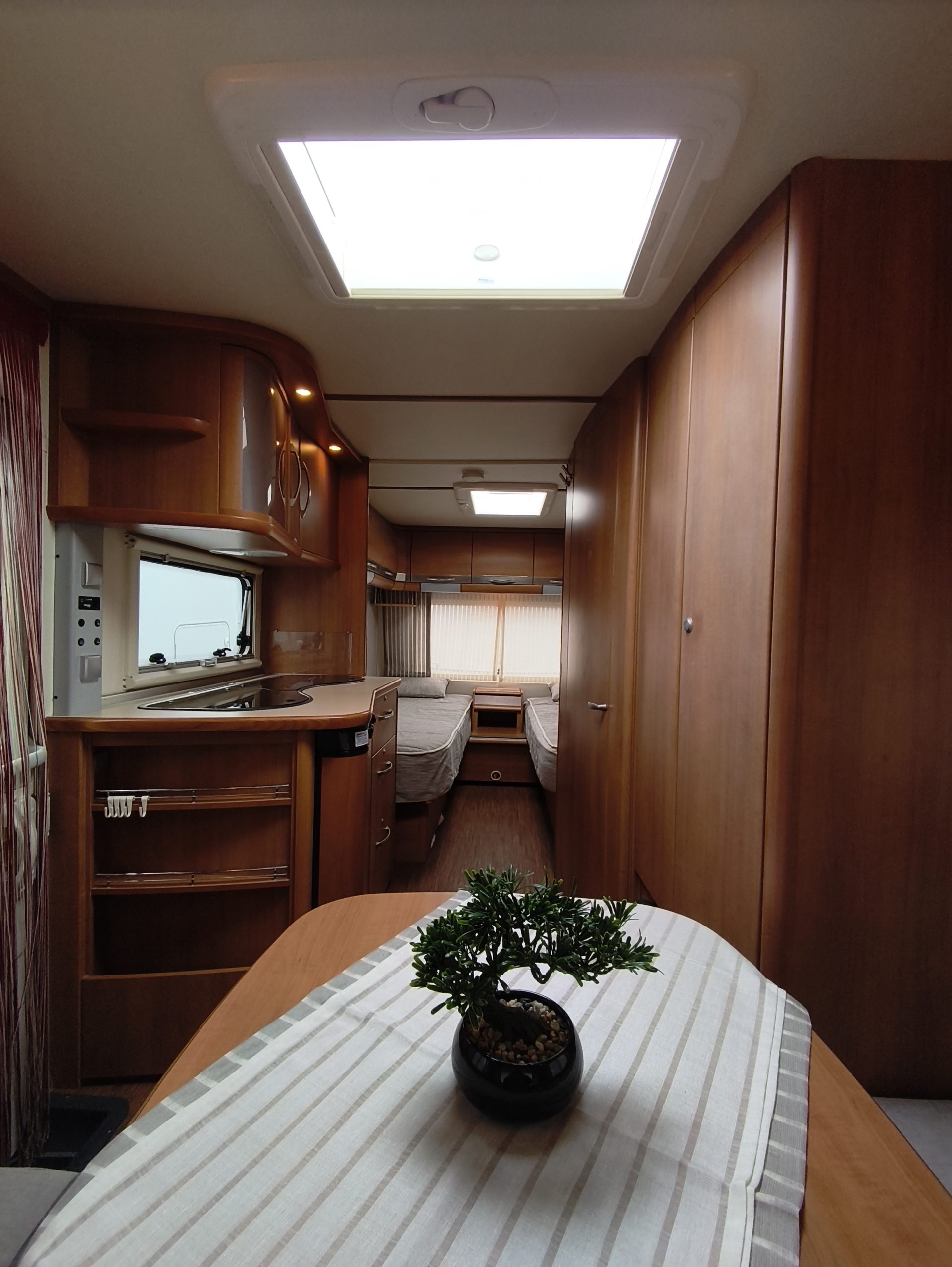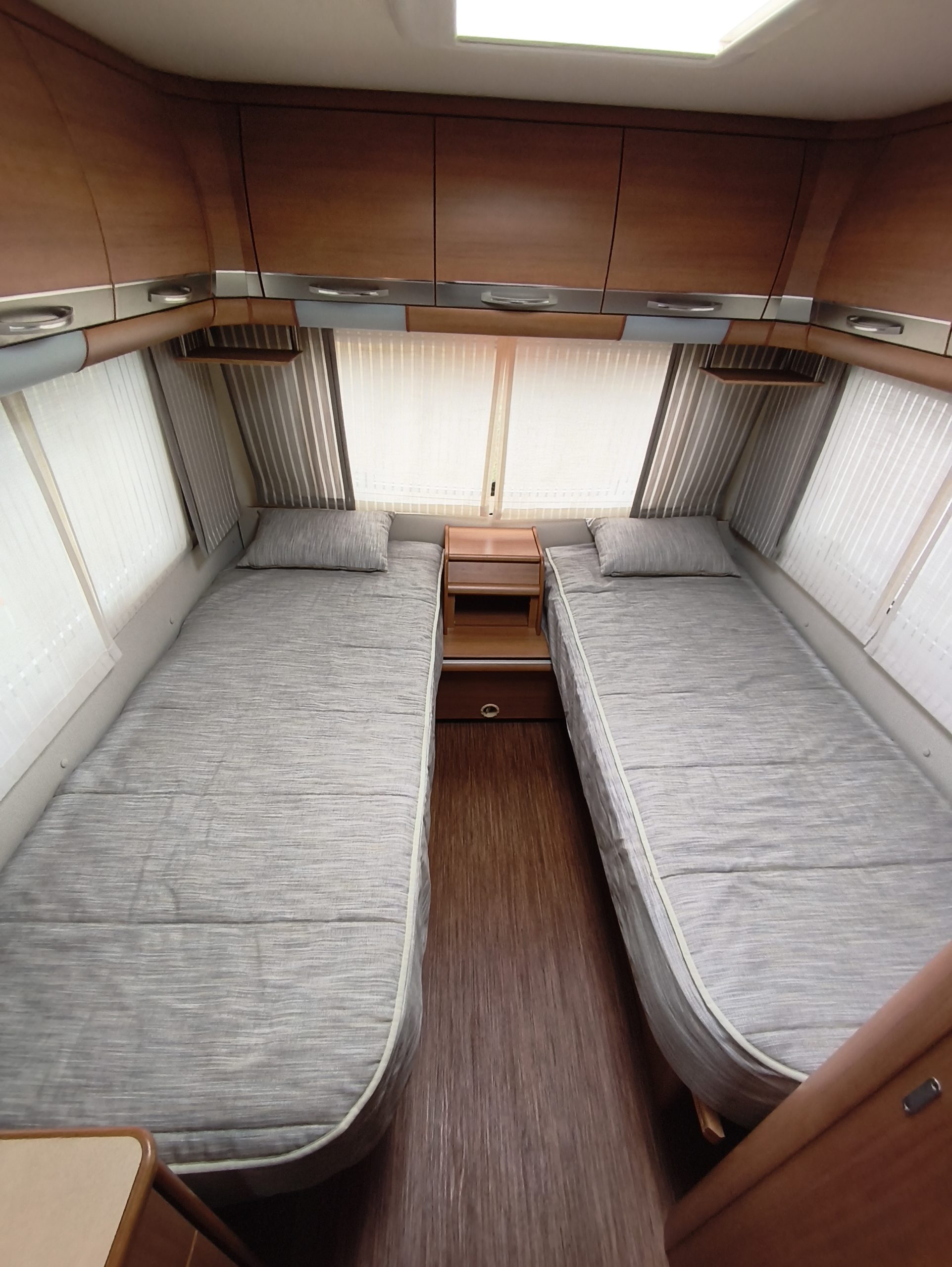 Einzelbetten im Heckbereich und Rundsitzgruppe im Bug (kann zu einem Bett umgebaut werden), alle Fenster ausstellbar mit Fliegengitter und Verdunkelungsrollo