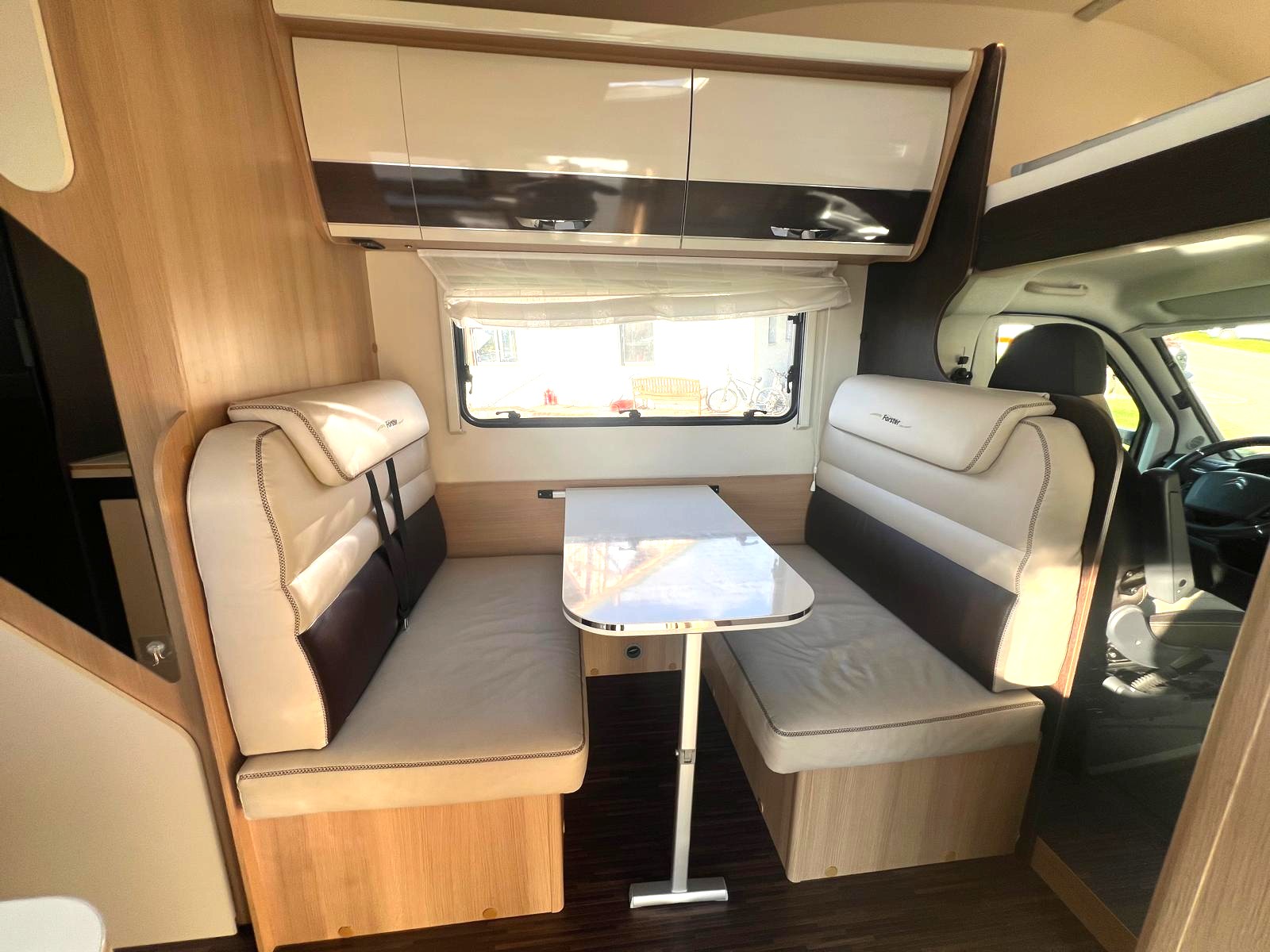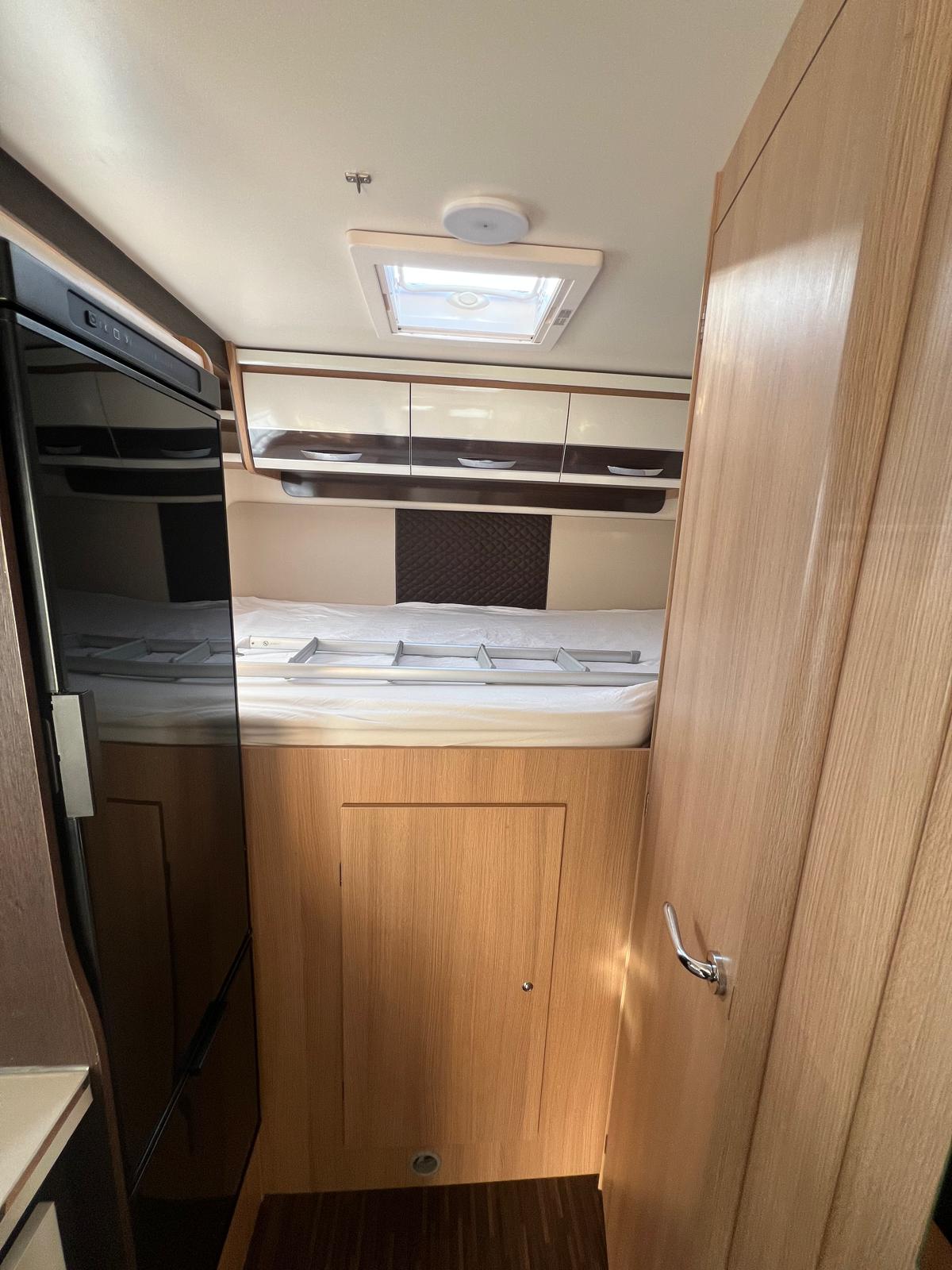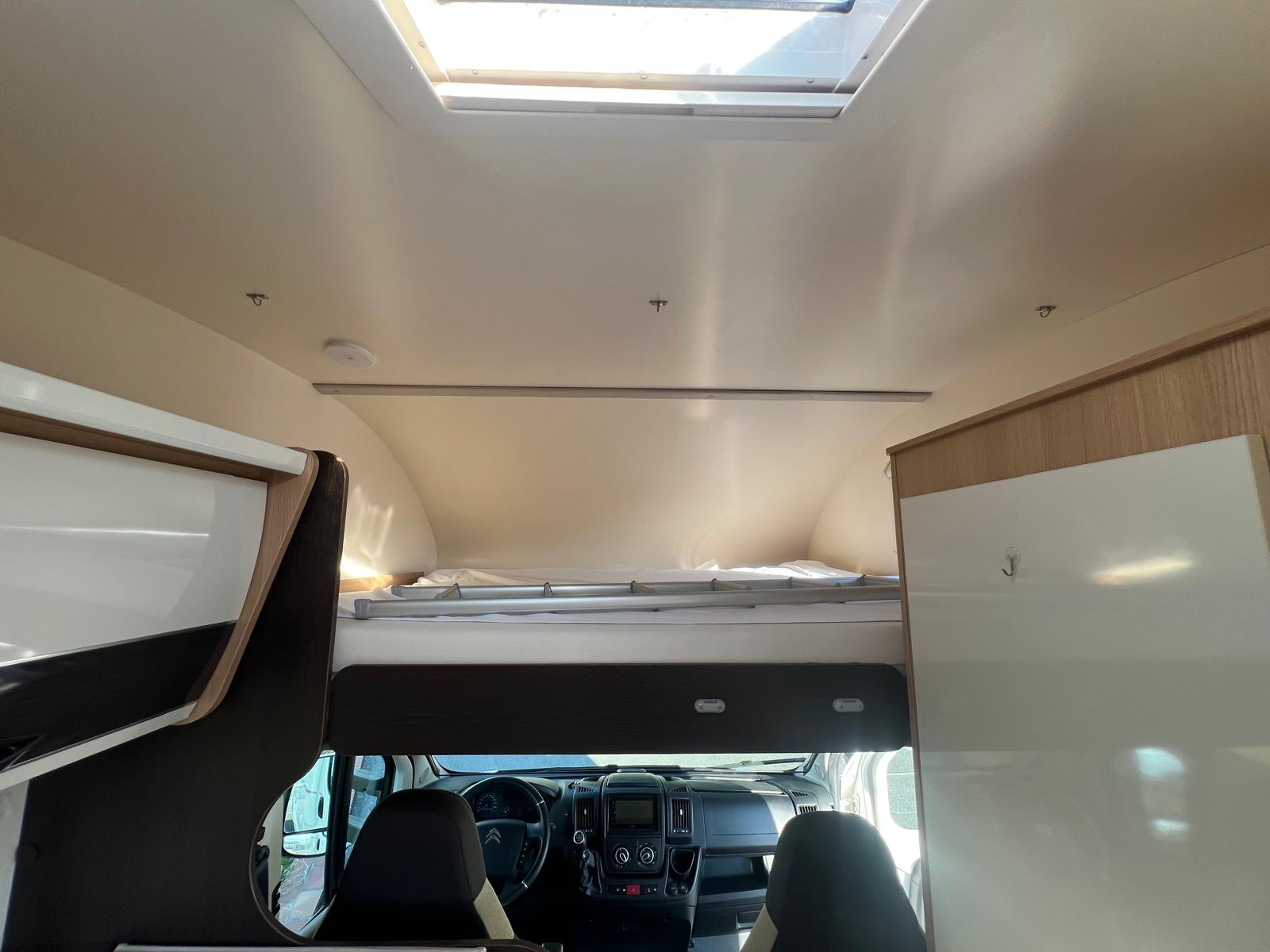 Querbett im Heck und ein weiteres Querbett im Alkoven, Seitensitzgruppe mittig ( kann zu einem Bett umgebaut werden ) alle Fenster ausstellbar mit Fliegengitter und Verdunkelungsrollo, Klima im Fahrerhaus, Fahrerhaussitze mit Armlehnen