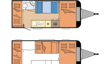 Querbett im Bugbereich, 2er Stockbett im Heckbereich, Seitensitzgruppe mittig (kann zu einem Bett umgebaut werden), alle Fenster ausstellbar mit Fliegengitter und Verdunkelungsrollo, Antischlingerkupplung, Frischwassertank 25l