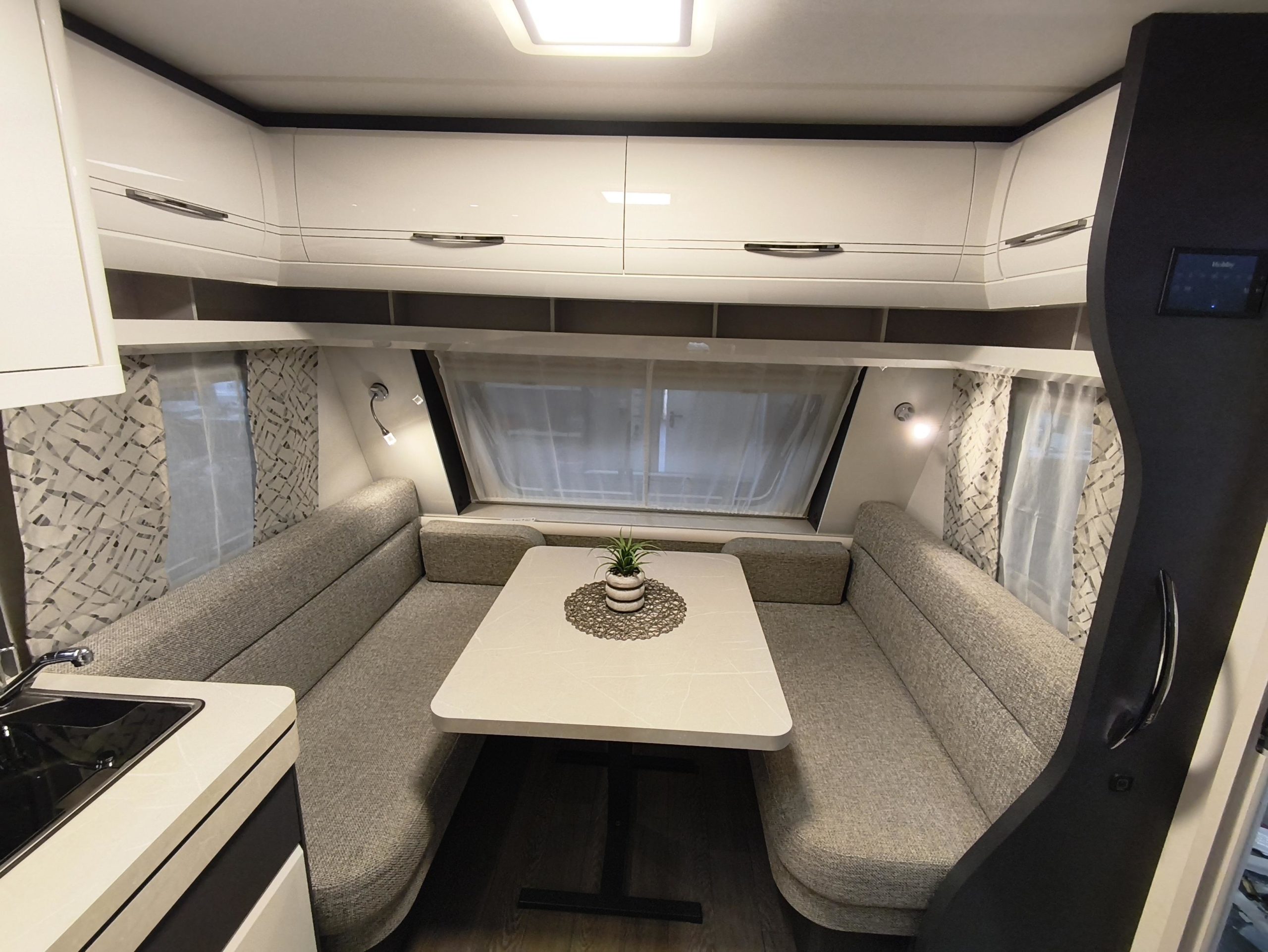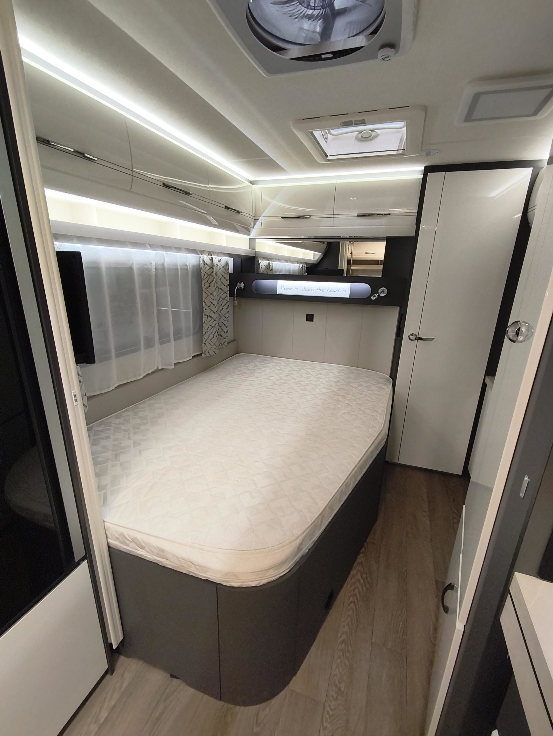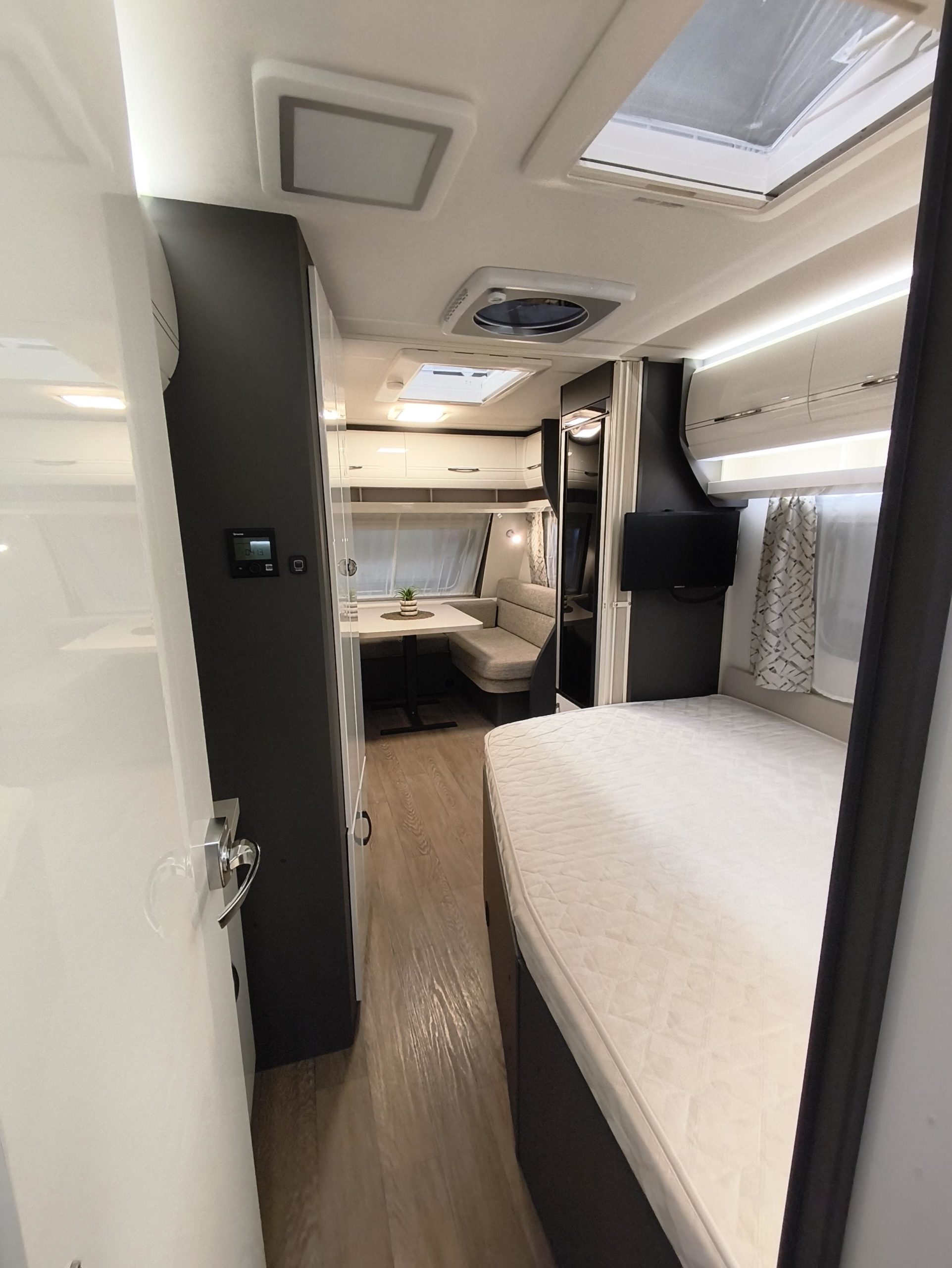 Französisches Bett, Seitensitzgruppe (kann zu einem Bett umgebaut werden), alle Fenster ausstellbar mit Fliegengitter und Verdunkelungsrollo, Antischlingerkupplung