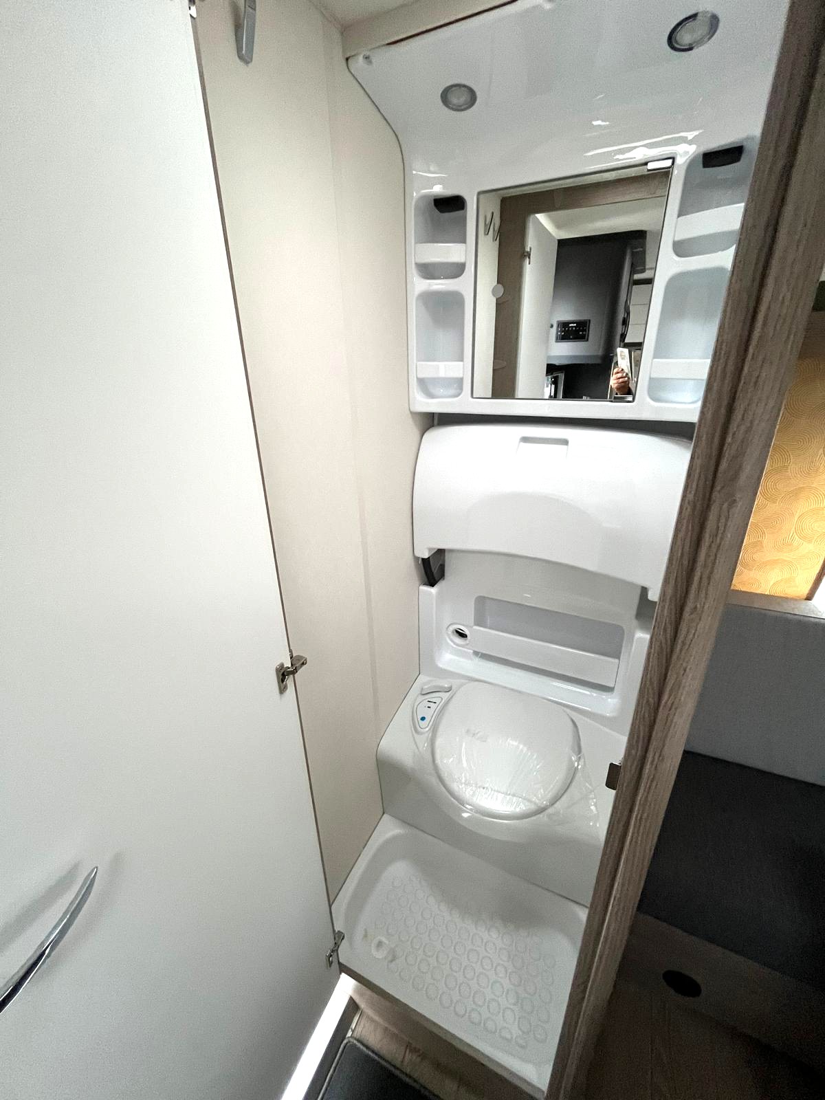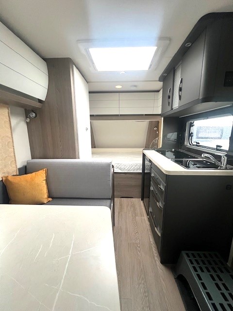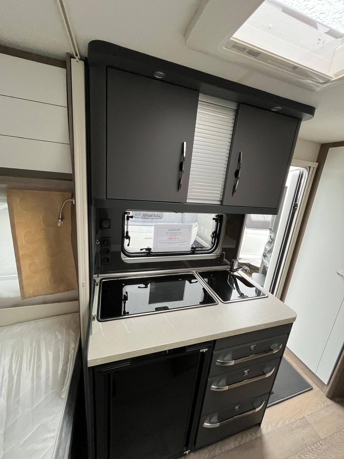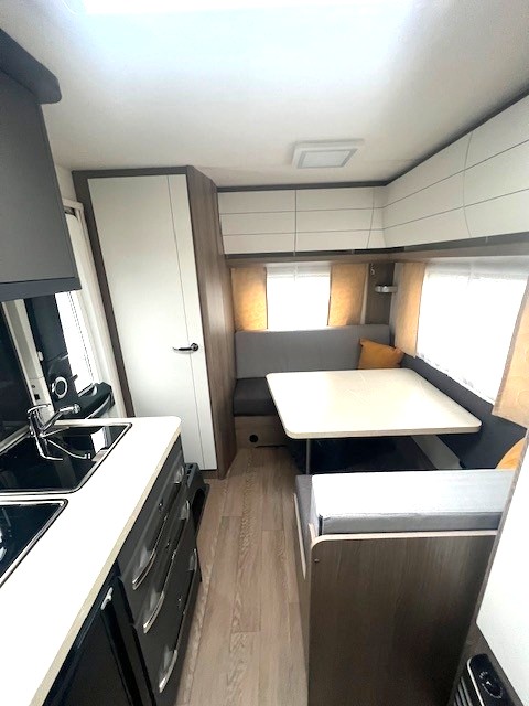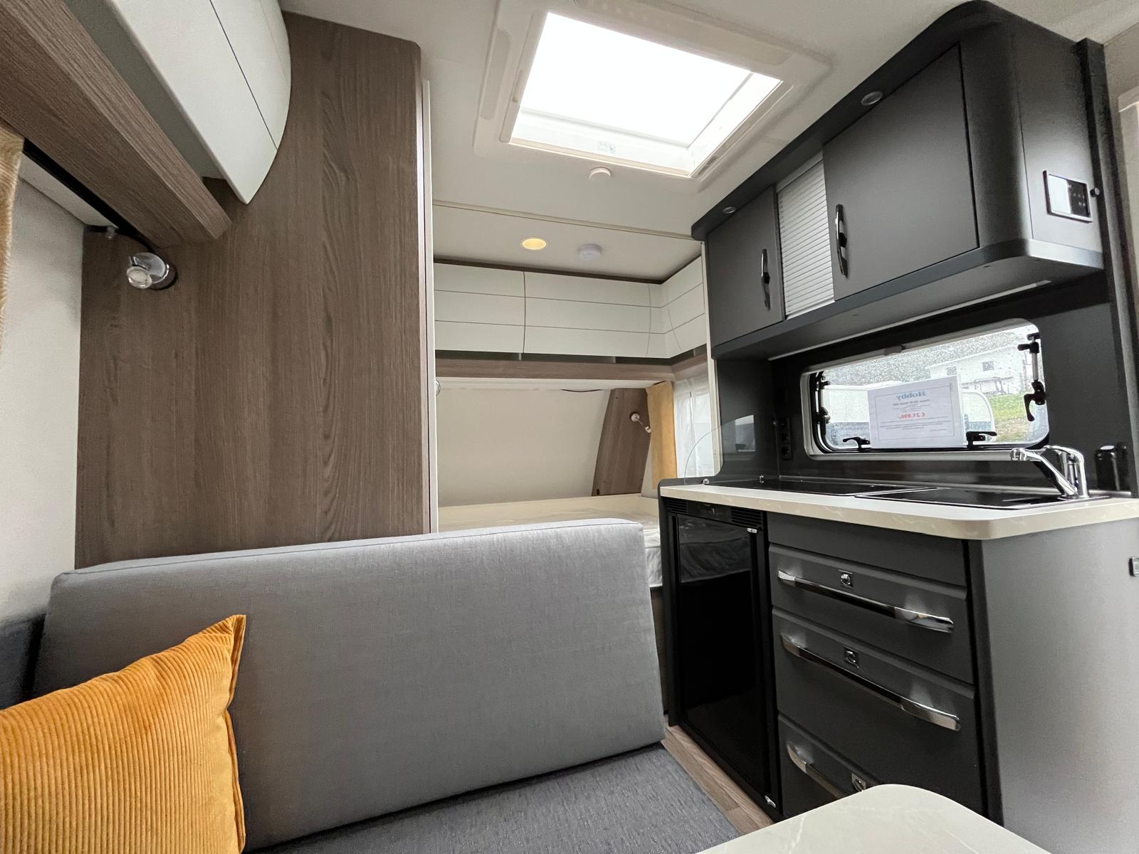 Querbett im Bug, Seitensitzgruppe im Heck (kann zu einem Bett umgebaut werden), alle Fenster ausstellbar mit Fliegengitter und Verdunkelungsrollo, Antischlingerkupplung, Serviceklappe unter dem Bett, Umluftheizung, Fliegengittertür Eingang, Frischwassertank 25l