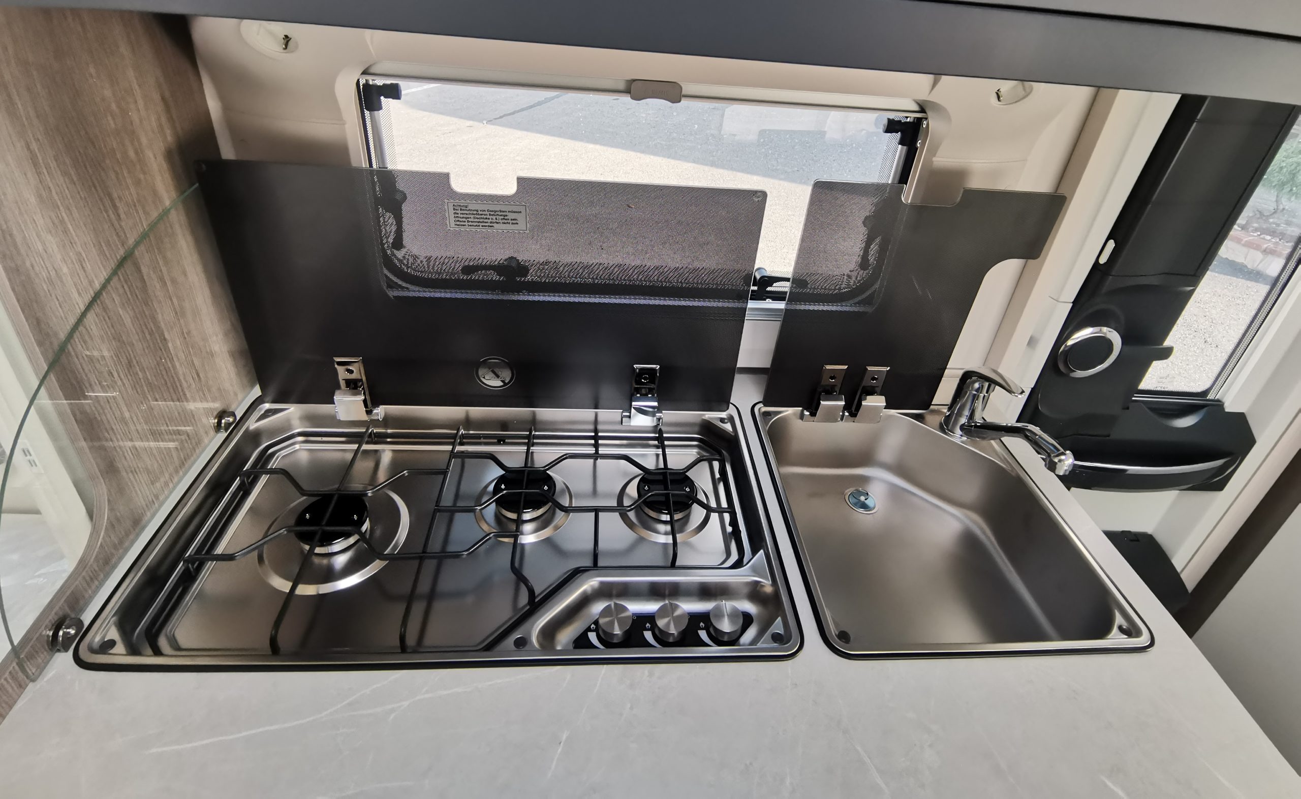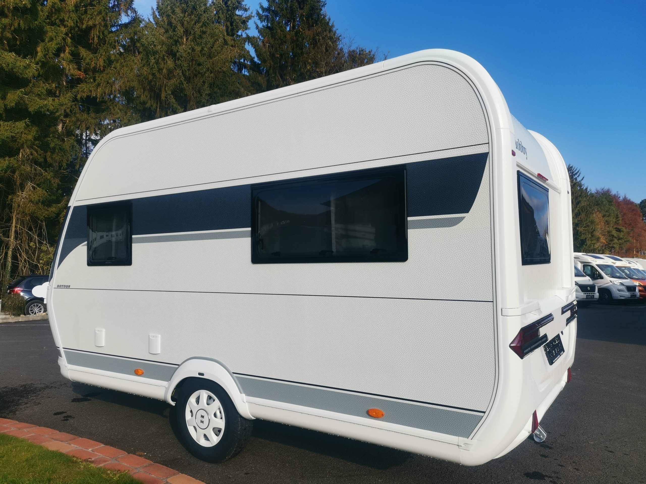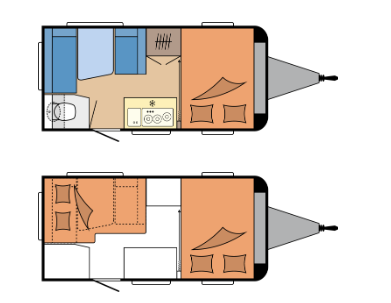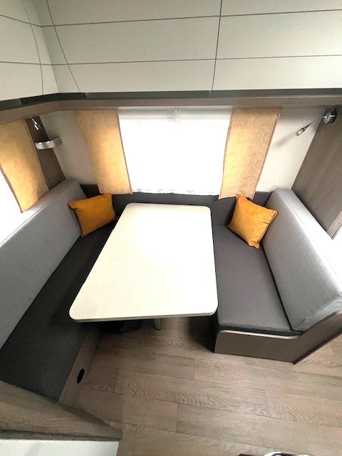 Querbett im Bug, Seitensitzgruppe im Heck (kann zu einem Bett umgebaut werden), alle Fenster ausstellbar mit Fliegengitter und Verdunkelungsrollo, Antischlingerkupplung, Serviceklappe unter dem Bett, Umluftheizung, Fliegengittertür Eingang, Frischwassertank 25l