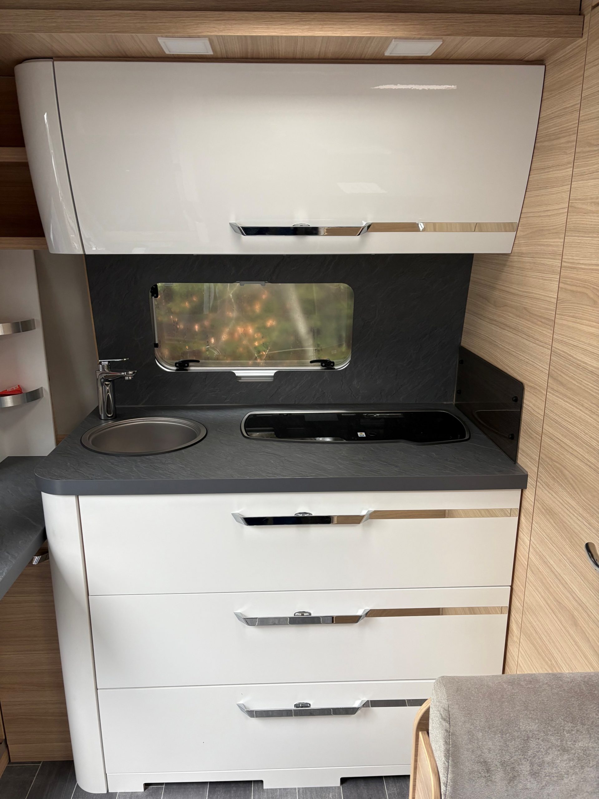 Seitensitzgruppe im mittleren Bereich ( kann zu einem Bett umgebaut werden), Queensbett im Bugbereich, alle Fenster ausstellbar mit Fliegengitter und Verdunkelungsrollo,